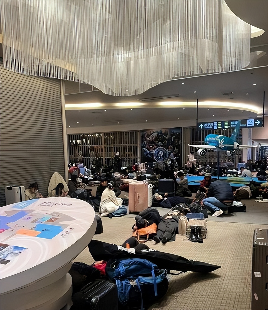 夜晚降临,机场航站楼成了临时避难所,地上到处都是席地而睡的旅客,有人裹着机场发放的薄毯蜷缩在墙角,冷风从缝隙里钻进来,让人根本没法安睡。