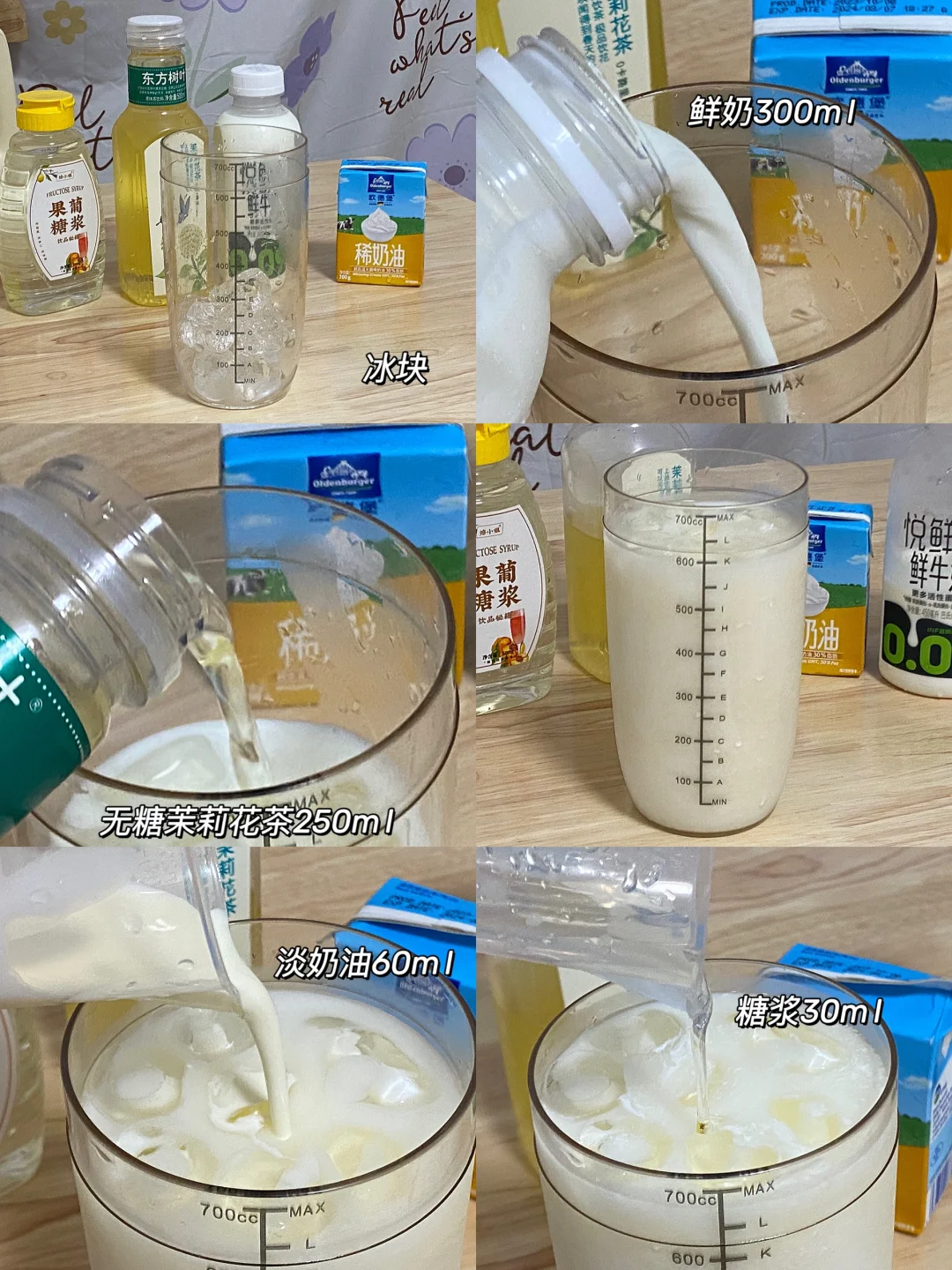 🌷食材:鲜奶300ml,茉莉花茶250ml(无糖),淡奶油60ml,糖浆30ml,冰块。 🌷做法:1.雪克杯中加入冰块,倒入鲜奶、淡奶油、糖浆。 2.搅拌搅拌,倒入饮品杯中。 🌷奶香浓郁,还有茉莉的清香,真的太好喝啦!!! 建议用鲜牛奶,口感会更好哦(一定要去试试[赞R][赞R][赞R])