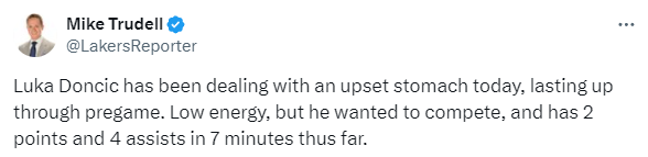 究竟东契奇怎么了?据湖人记者Mike Trudell报道,今天东契奇一直在和胃部不适作斗争,这种情况一直持续到了赛前,但他仍然带病坚持比赛。