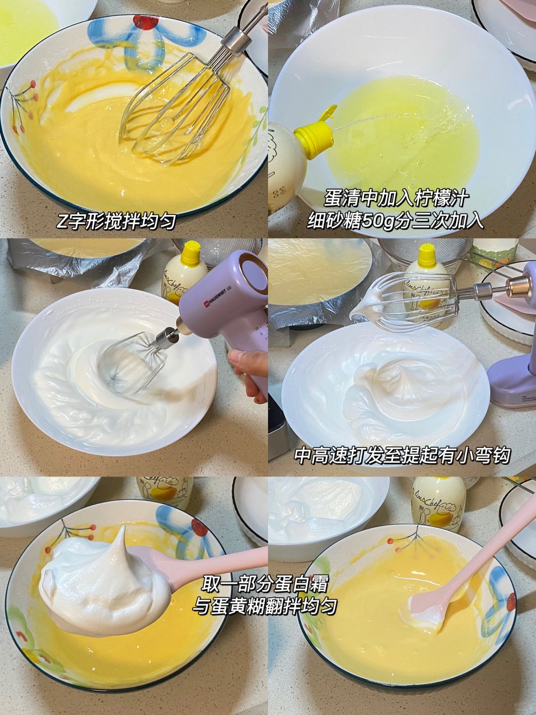 3.蛋清中加入几滴柠檬汁,细砂糖分三次加入,打发至提起有小弯钩,取一部分蛋白霜与蛋黄糊翻拌均匀,再倒回蛋白霜中,快速翻拌均匀。