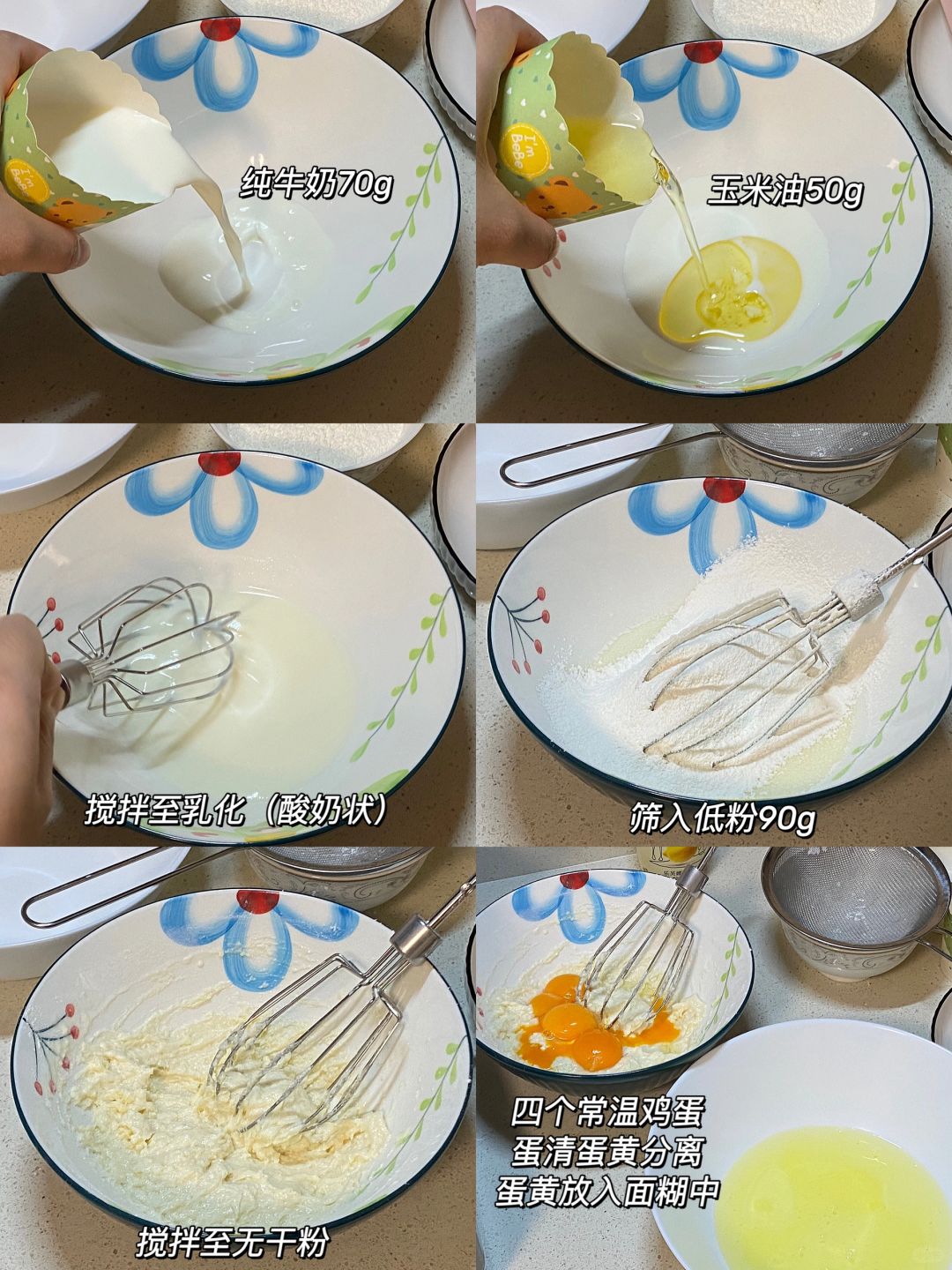 🌷食材:纯牛奶70g,玉米油50g,低筋面粉90g,鸡蛋4个,细砂糖50g。