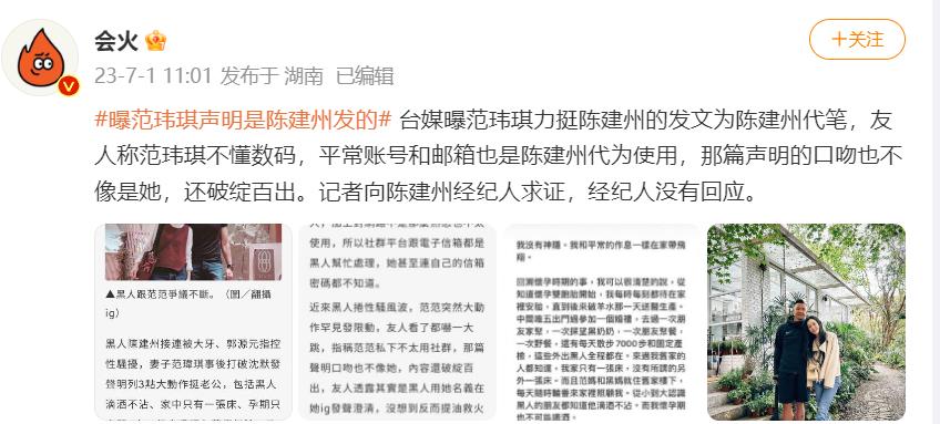范玮琪为丈夫正名的小长文才发出去没多久,就有媒体称范玮琪的小长文其实是陈建州代发的,为了增加可信度还专门罗列了一些证据。