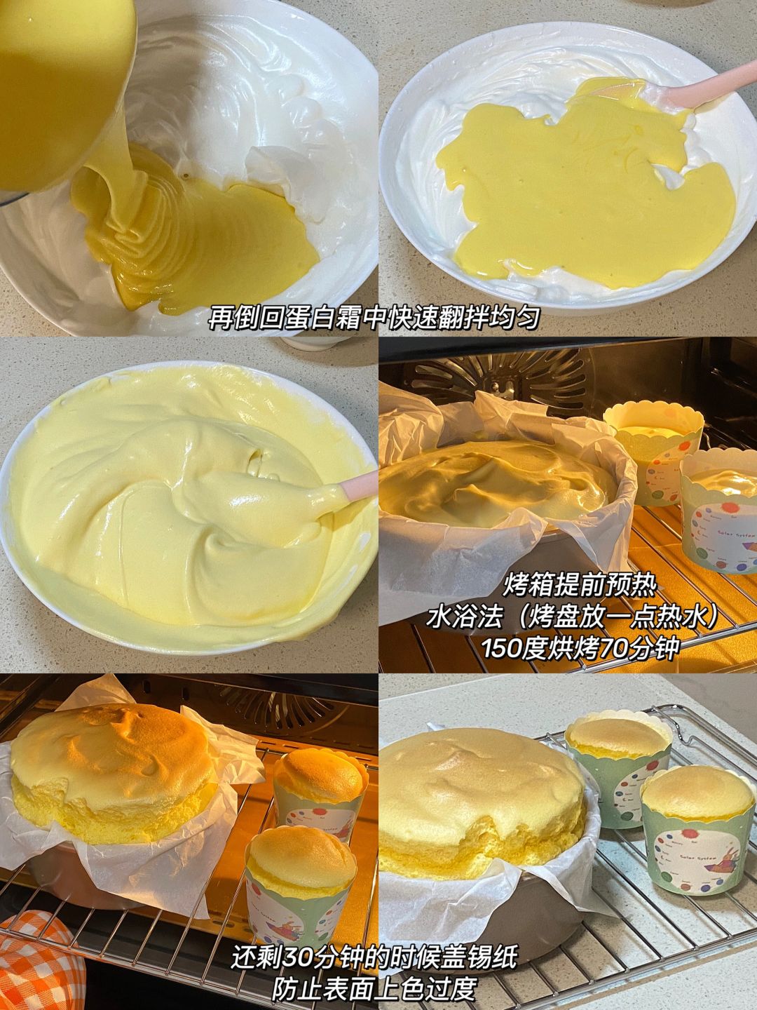5.烤箱提前预热,烤盘上放一些热水,水浴法150度烘烤70分钟,还剩30分钟记得盖上锡纸防止上色过度。