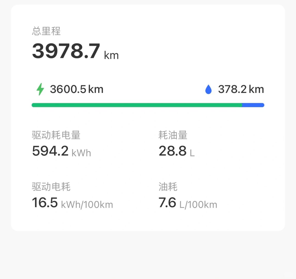 我说最近是不是一直纯电模式开?她说是,基本没用过油,我打开App一看,跑了3978公里,纯电跑了3600公里,90%的时间都是当电动车用……