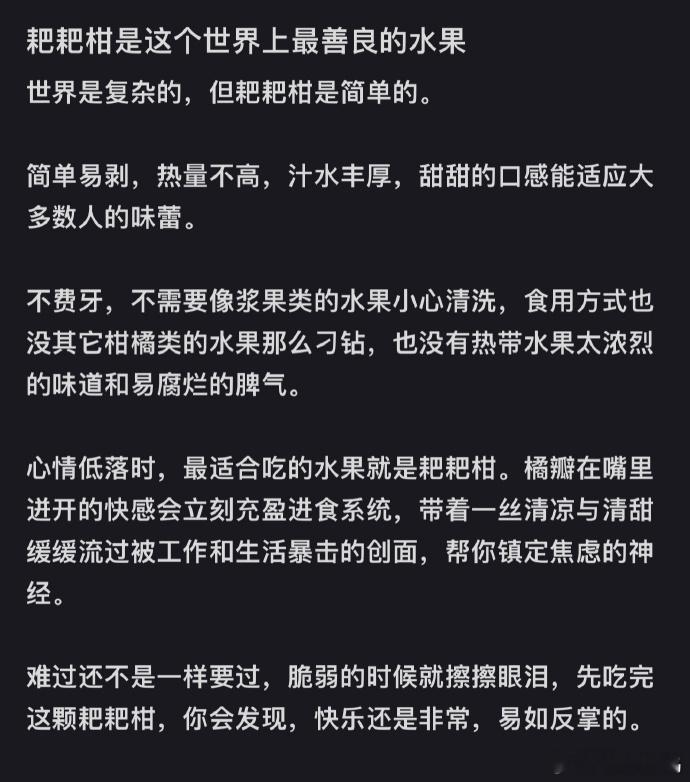 粑粑柑原来还有这么一个说法,经过大神们这样一说,还真的是一下子就通了。这水果果然善良,相比甘蔗、菠萝蜜、榴莲等来说,要和蔼温柔了许多吧。#耙耙柑 善良的水果#