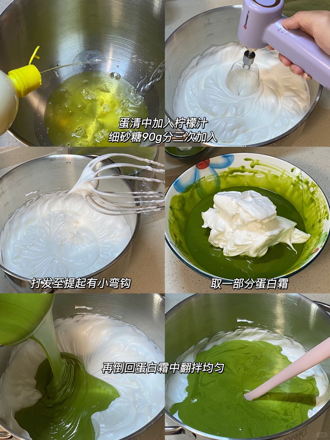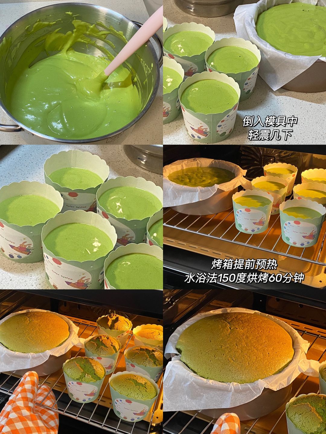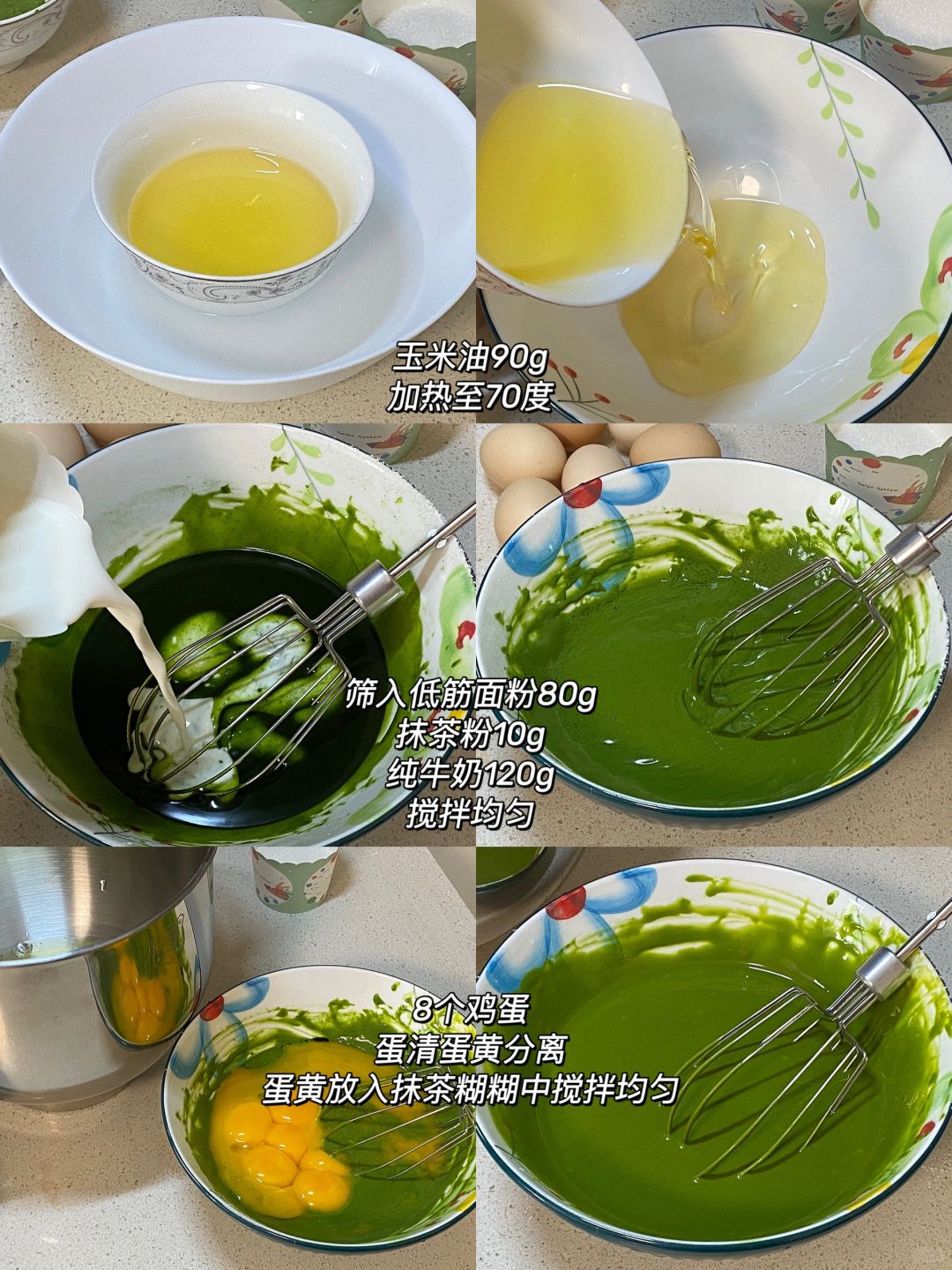 🌷食材:低筋面粉80g,抹茶粉10g,纯牛奶120g,玉米油90g,鸡蛋8个,细砂糖90g。