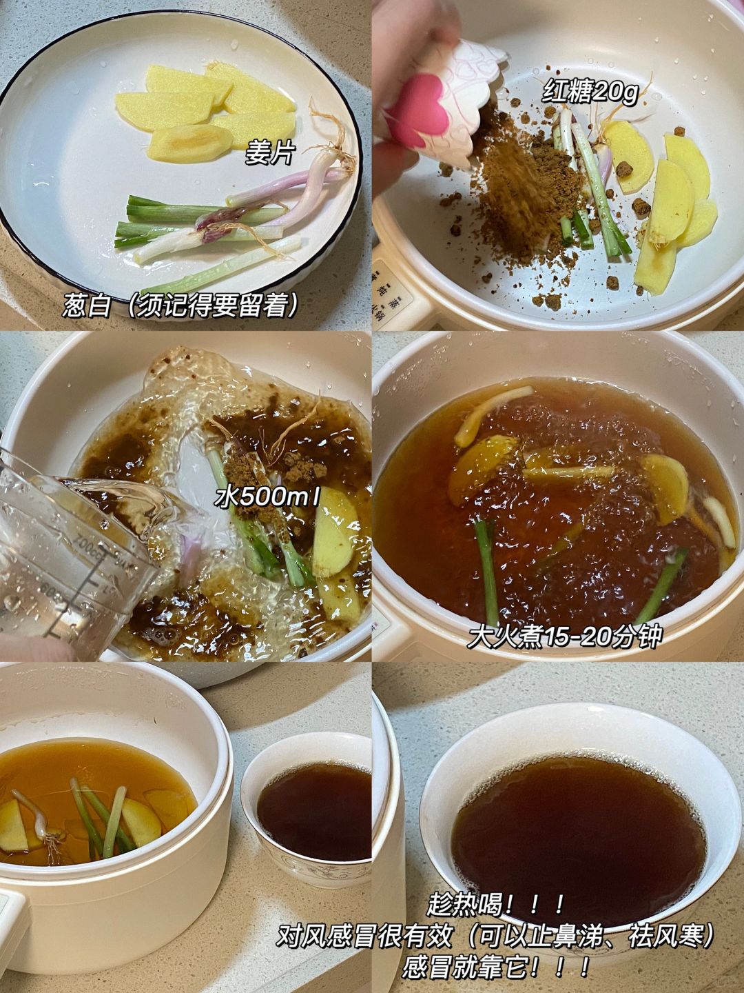 🌷食材:生姜,葱头,红糖。 🌷做法:将所有食材放入锅中,倒入500ml的水,大火煮15-20分钟煮沸,趁热喝!!! 🌷对风寒感冒真的有效,可以止鼻涕、祛风寒,感冒就靠它了[赞R][赞R][赞R]