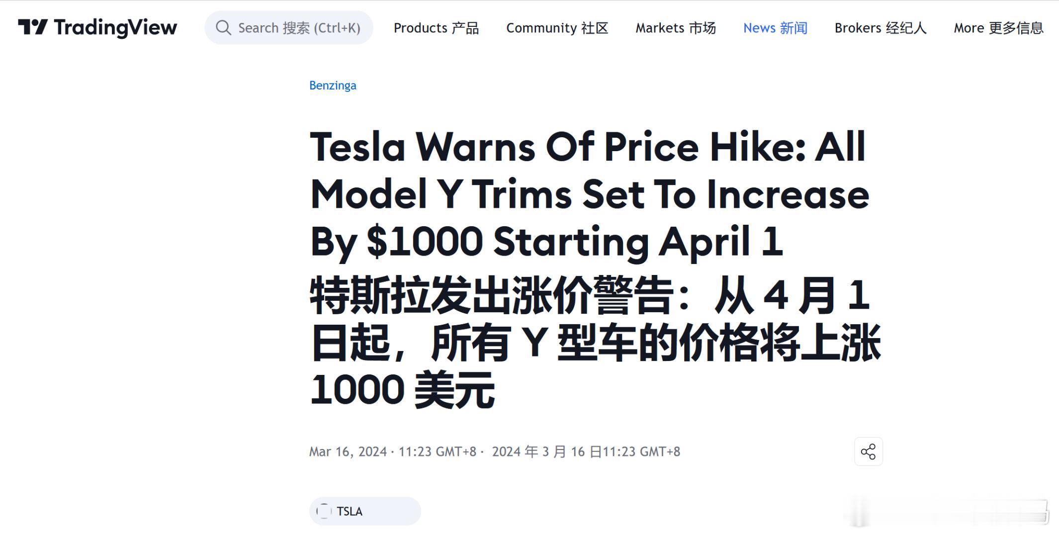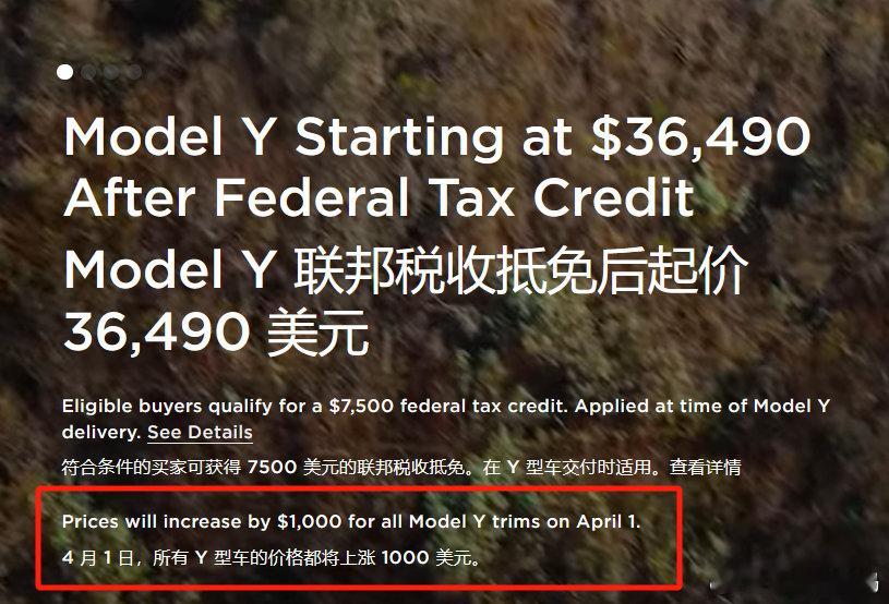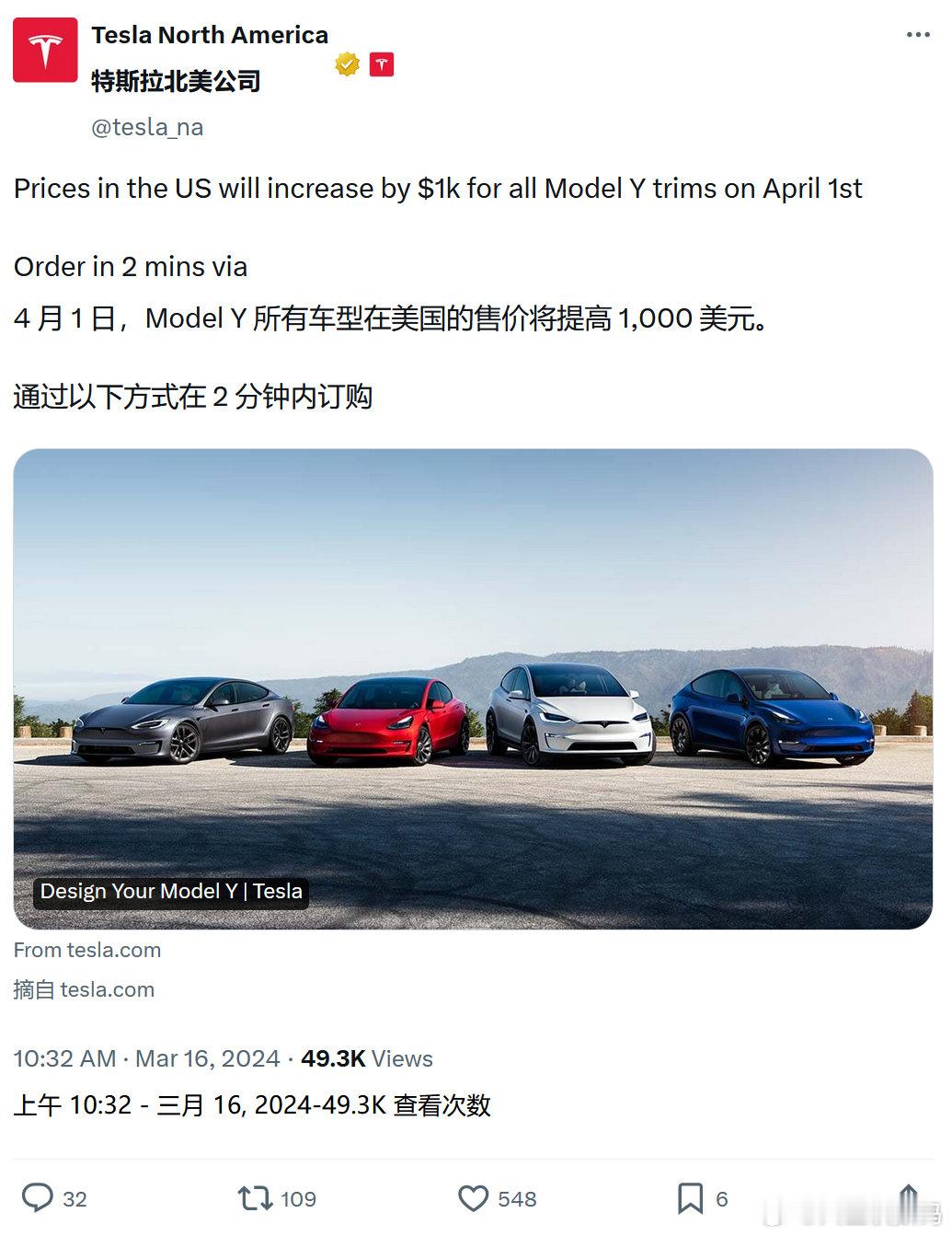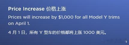 2024年3月16日,特斯拉北美官网和社交媒体宣布:从 4 月 1 日起,Model Y全系车型价格上涨1000美元(约合人民币7196元),起售价上调至 44990 美元(约合人民币32.3748万元)。
