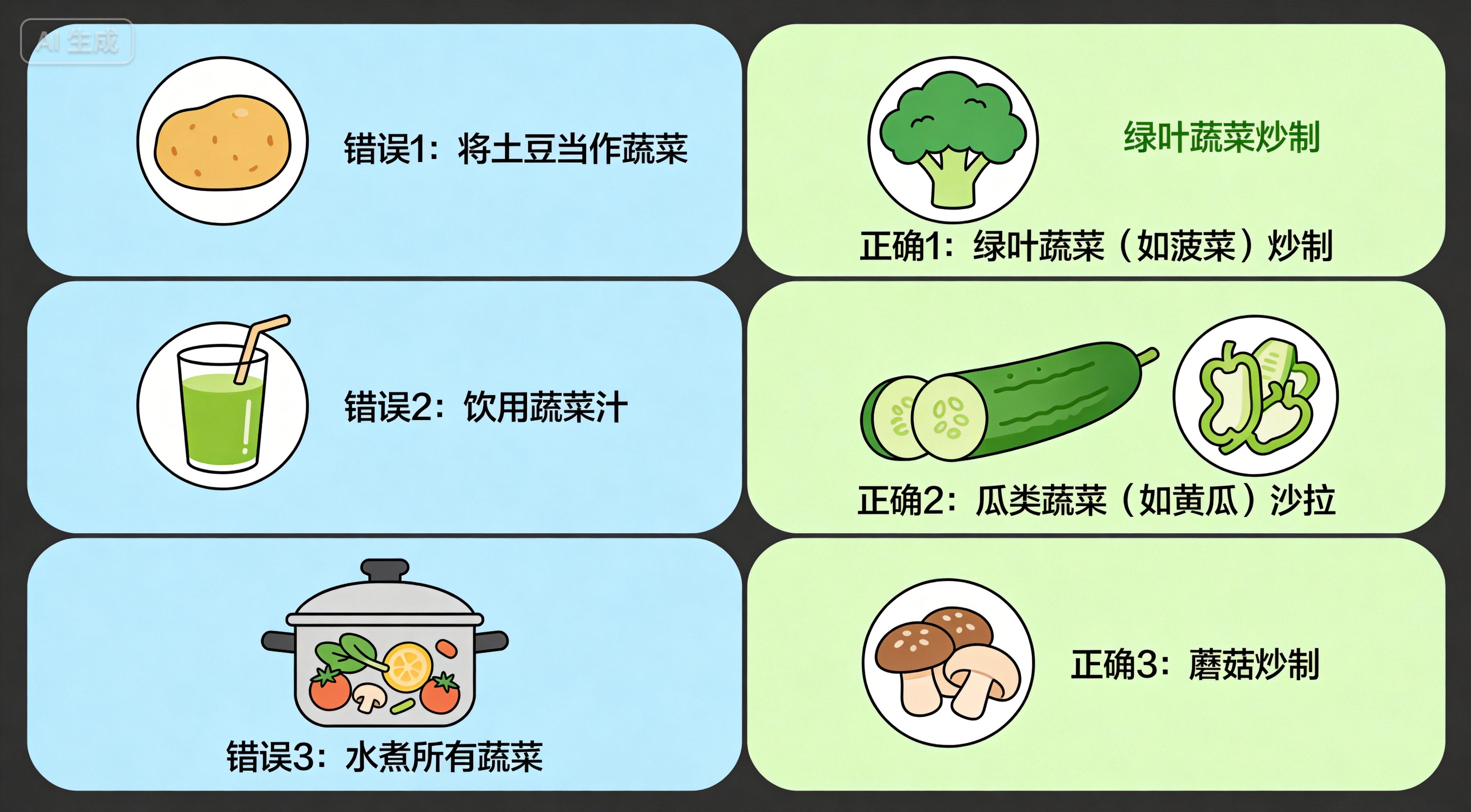 蔬菜的致命误区土豆当菜吃错。土豆淀粉含量17.2%,是主食不是菜。吃一盘土豆丝,等于多吃一碗饭。你以为在吃菜,实际在吃主食,血糖能不升吗?