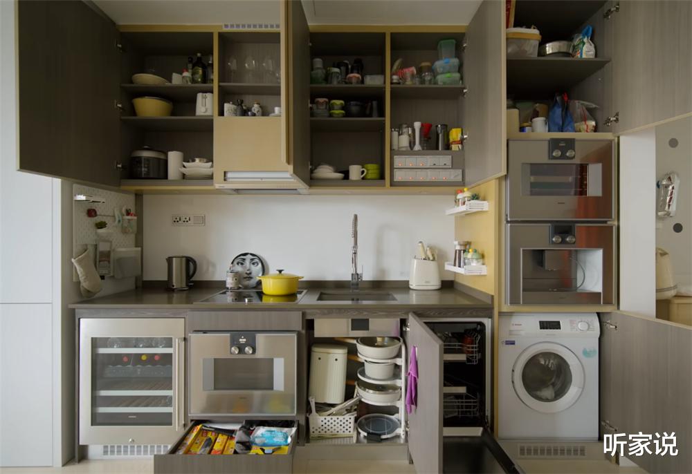 收纳更不必多言,从吊柜到底柜,塞满了各种各样的餐厨具用品,也嵌入了包括洗衣机在内的各种电器,虽然满满当当地,但却乱中有序。