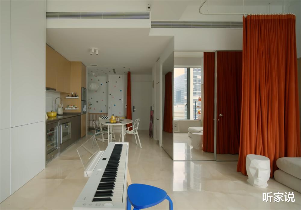 但即便是在客厅的状态下,这道窗帘也有着分隔动静区域的功能,且比以前的硬性隔断要更加灵动,更有设计感一些。