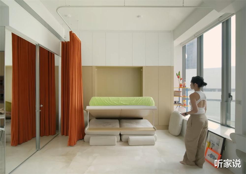 李乔茜说,平时可以直接把懒人沙发展开当做双人床,但如果有家人朋友来做客的话,也可以将墙面里的折叠床降下,相当于多出来一个双人位的睡眠区域。