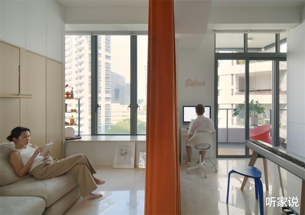 最起码,这道帘子可以将客厅一切为二,分成妻子读书的沙发区域,和丈夫工作的书房空间,别看就是这么一道简单的窗帘,却能让二人互不打扰。