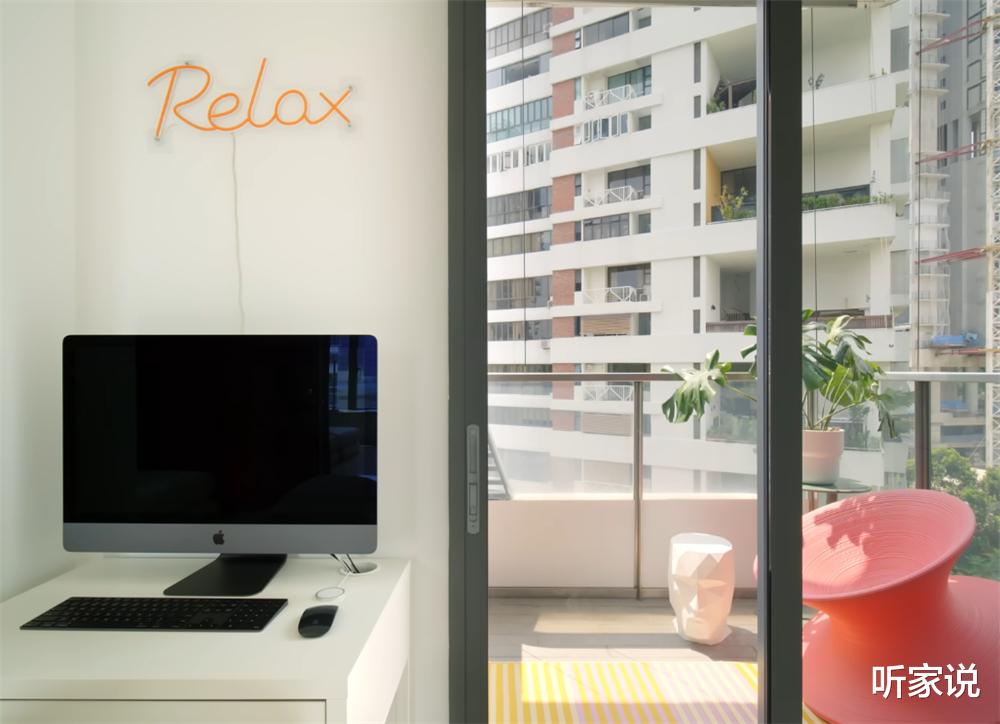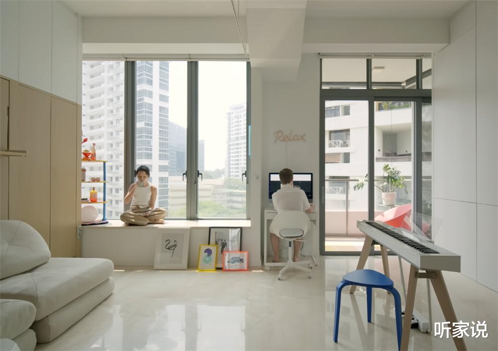 现在再看,这间灵活的客厅拥有他们想要的的一切,从不设茶几的大面积留白空间,到阳台门旁的电脑桌,再到休闲飘窗和可以随意移动的电子琴,一家三口想要的它都有。