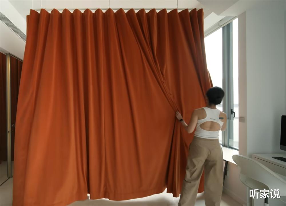 全屋最引人瞩目的装修,莫过于将隔断拆除改用窗帘隔断,此举在我看来有利有弊,但对李乔茜一家三口来说,却颇为合适,最起码能将单间变成两间灵活的卧室,还不影响空间感。