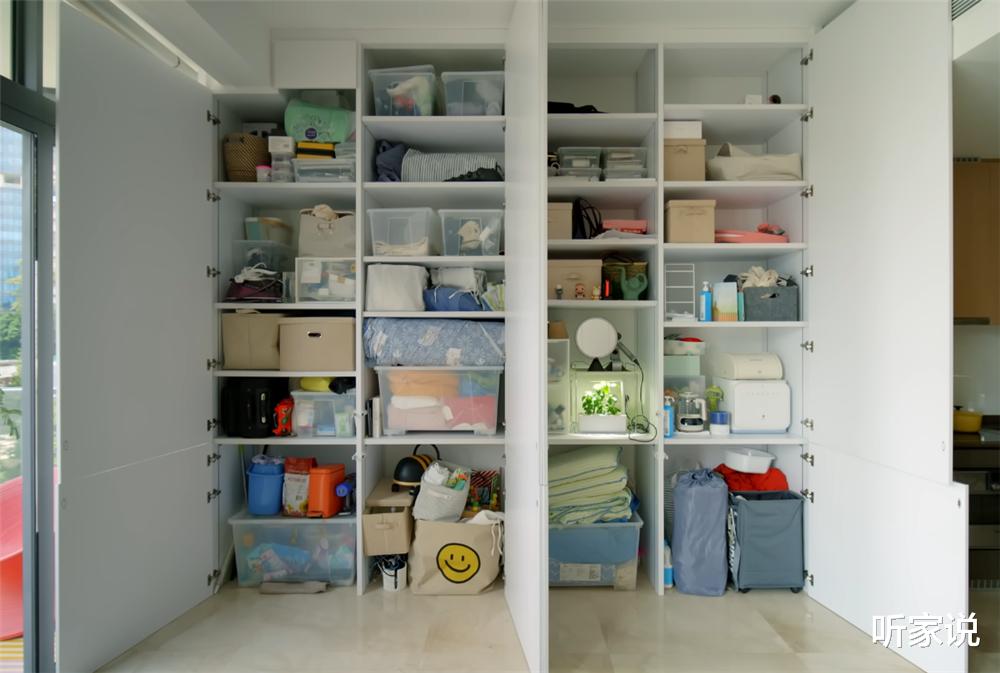 柜内是大大小小的收纳格,毕竟不用考虑衣柜收纳,切分隔板可以将纵向空间更充分利用起来,放下更多家居杂物和零碎小件,实用性颇强。