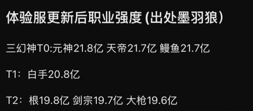 • T0档:元素(21.8亿)、修罗(21.7亿)、漫游(21.7亿)。这三个职业在当前版本中表现极为出色,伤害位居前列。