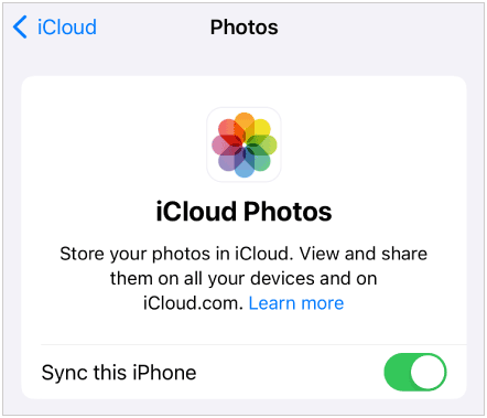 步骤 3:选择“照片”,然后打开“同步此iPhone ”。然后您的照片将通过网络保存到您的 iCloud 帐户。