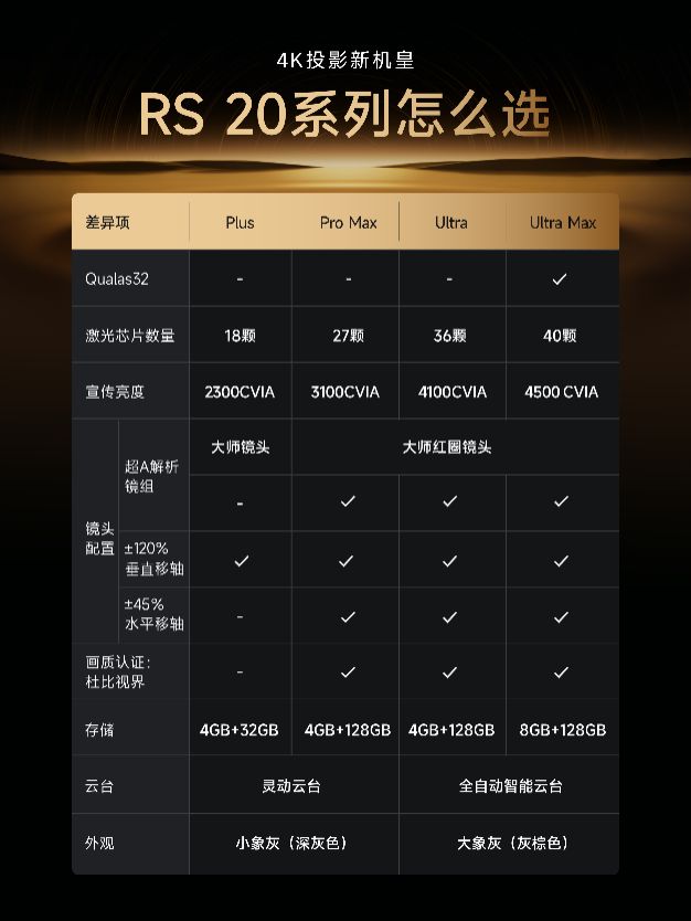 5月8日,极米重磅推出RS 20系列,共发布RS 20 Plus、RS 20 Pro Max、RS 20 Ultra、RS 20 Ultra Max四款产品。该系列以无损4K画质、领先的色彩能力、电竞级性能参数为核心突破,重新定义家用投影仪的体验边界,将专业级影像技术带入大众市场,满足影音爱好者、游戏玩家及家庭用户的多元化需求。