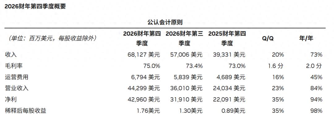 2 月 25 日,英伟达公布财报,第四财季营收 681 亿美元,同比增长 73%。净利润 429.6 亿美元,同比增长 94%。毛利率 75%。三项数据全部刷新公司历史纪录,也全部超过分析师预测。
