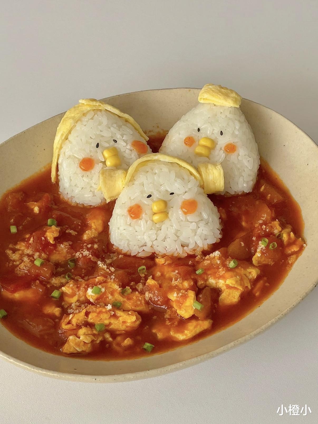 趁炒番茄时,用保鲜膜包米饭,团成圆球,再团一个小球当头。海苔压出小圆眼睛,胡萝卜花刀剪成三角嘴,芝士片用吸管压出“腮红”,一贴,一只“干饭小鸡”就对你wink。把番茄炒蛋舀进盘子,小鸡蹲中间,拍照开滤镜,点赞“咻咻”涨。
