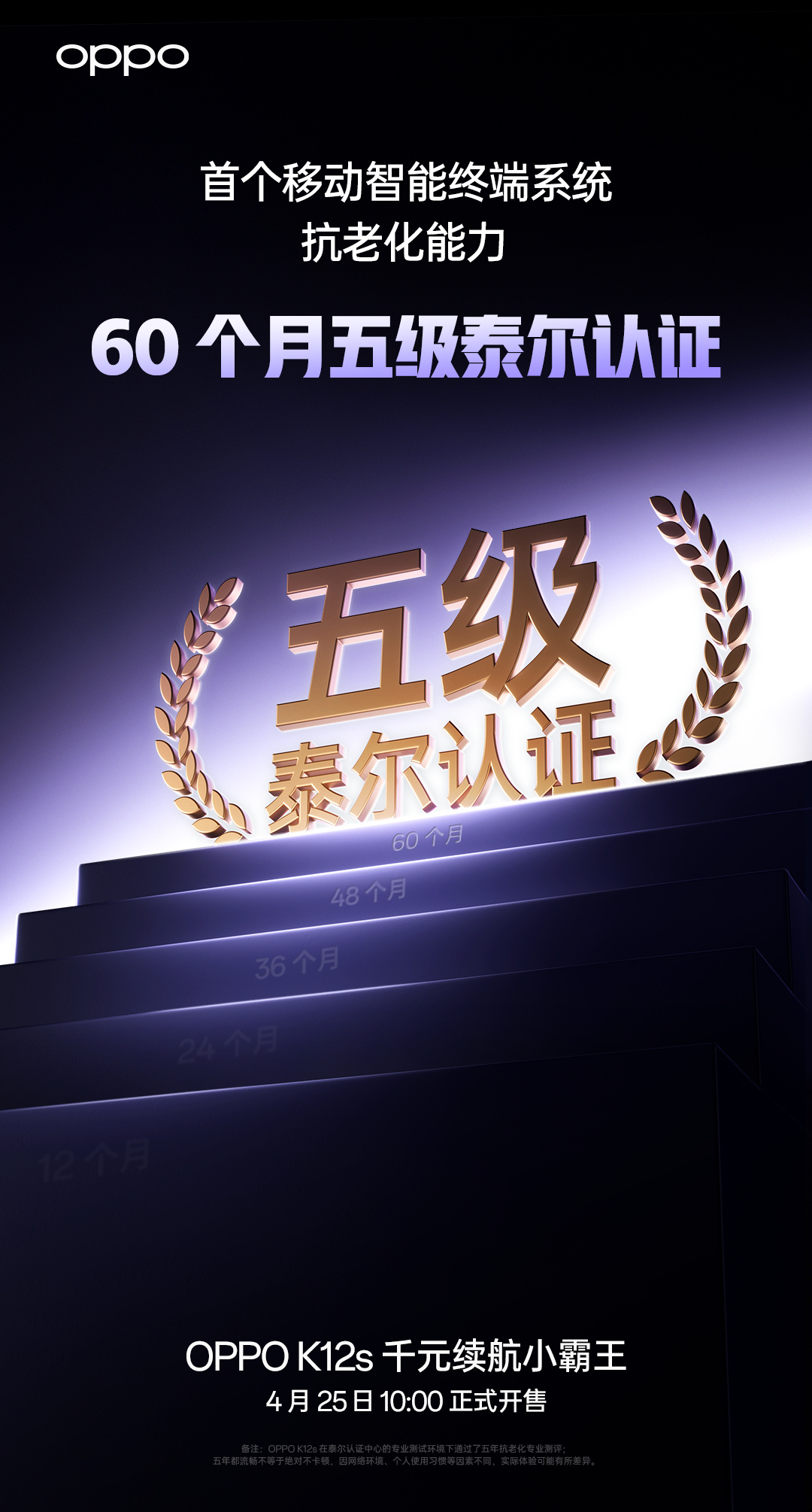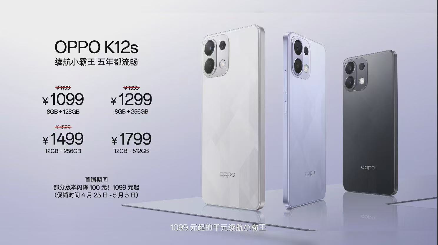 千元机市场杀疯了!OPPO K12s今日正式发布,1099元起直接锁死「续航小霸王」称号!这手机光看配置就让人直呼离谱——7000mAh电池+五年不卡顿,怕不是要把充电宝行业逼上绝路?1、同级唯一的7000mAh石墨电池续航日常使用轻松实现一天一充,甚至2天一充都不在话下,更离谱的是,这块电池通过1800次充放电循环测试后仍能保持80%容量,相当于五年后照样耐用,这是要变「传家宝」的节奏?2、越级的80W快充 30分钟充电62%的极速回血,配合自研智慧充电引擎5.0,边玩边充也能智能控温。对比同价位普遍采用的33W方案,OPPO这波堪称降维打击,吃顿早餐的时间就够用大半天。3、五年流畅不卡顿 骁龙6 Gen4芯片+泰尔实验室60个月抗老化认证,日常多任务切换丝滑流畅,ColorOS 15系统深度优化,彻底打破千元机「用久必卡」的魔咒,电池用5年,系统也是流畅5年,绿厂真有你的!4、户外场景全能战士 IP65防水防尘+湿手触控+无网通话三件套,暴雨天抢外卖单、登山遇险求救都能稳如泰山,6.67英寸OLED直屏支持手套模式,北方用户冬天再也不用脱手套操作,细节设计直击痛点。5、颜值与质感并存 8.45mm轻薄机身搭配棱镜纹理后盖,星芒白/玫瑰紫/棱镜黑三款配色自带赛博美学光影,直角金属质感中框+磨砂防指纹处理,千元机竟玩出了旗舰设计感。 价格与发售信息 8+128G:1099元 | 8+256G:1299元 12+256G:1499元 | 12+512G:1799元 4月25日10点全平台开售,叠加国补后最低935元起,这还要啥自行车啊?