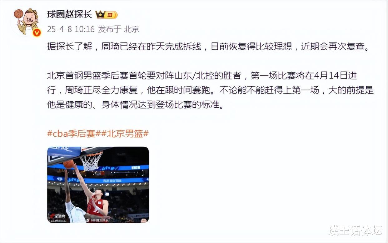 北京首钢男篮季后赛首轮要对阵山东/北控的胜者,第一场比赛将在4月14日进行,周琦正尽全力康复,他在跟时间赛跑。不论能不能赶得上第一场,大的前提是他是健康的、身体情况达到登场比赛的标准。