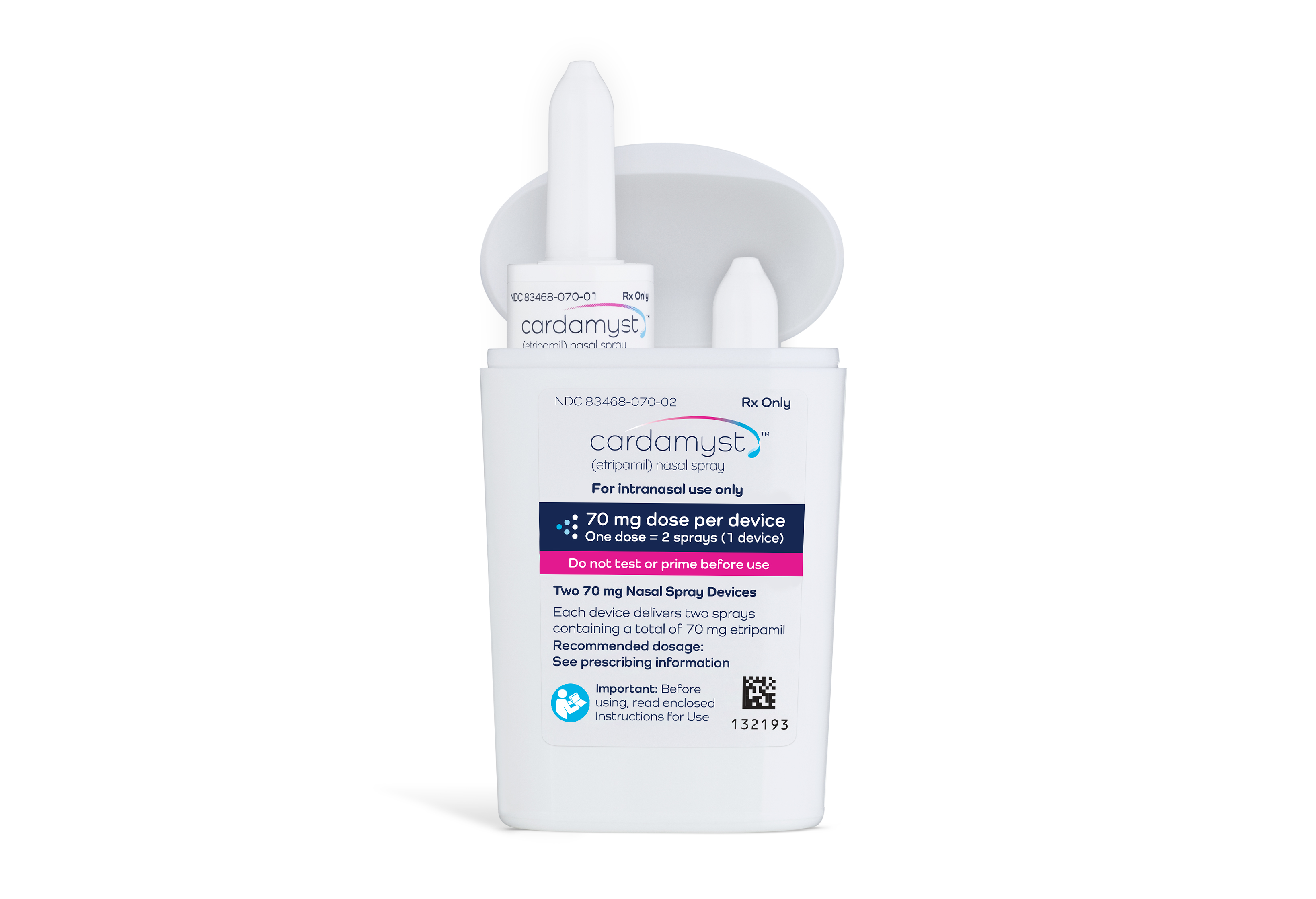 Etripamil是一种速效L型钙通道阻滞剂,设计用于患者鼻内给药,以在急诊科或其他医疗机构之外治疗阵发性室上性心动过速发作。Cardamyst以纸盒包装,内含2个一次性鼻喷雾器,每个喷雾器可喷2次,共含70m g etripamil。使用前无需测试或预充喷雾器。建议初始剂量为每侧鼻孔喷1次(共70mg)。如果首次用药后症状持续10分钟,患者可再次使用70mg;24小时内剂量不应超过140mg。