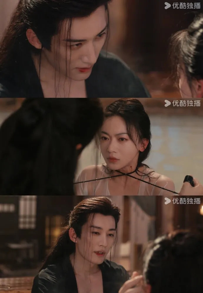 转瞬之间,眉林却被王爷又是用簪子抵住喉咙,又是被绳子锁喉,刚有松懈之后,又被王爷拉着在浴池里强吻一番,两人的互动全程滋滋冒着危险火花,性张力拉满~