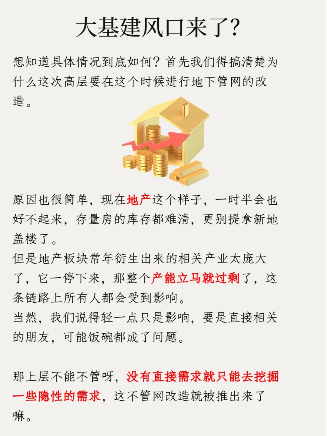 原因也很简单,现在地产这个样子,一时半会也好不起来,存量房的库存都难清,更别提拿新地盖楼了。但是地产板块常年衍生出来的相关产业太庞大了,它一停下来,那整个产能立马就过剩了,这条链路上所有人都会受到影响。当然,我们说得轻一点只是影响,要是直接相关的朋友,可能饭碗都成了问题。
