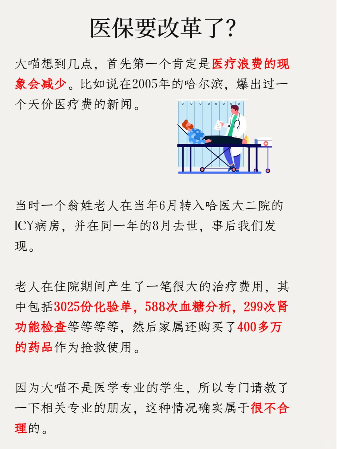 大喵想到几点,首先第一个肯定是医疗浪费的现象会减少。比如说在2005年的哈尔滨,爆出过一个天价医疗费的新闻。