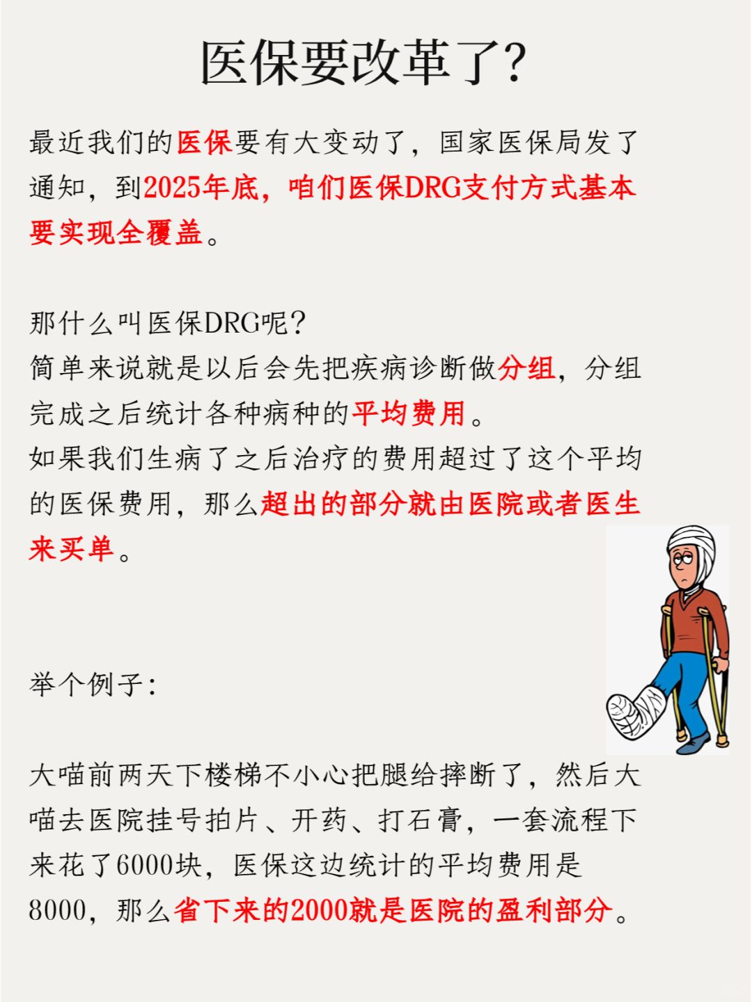 最近我们的医保要有大变动了,国家医保局发了通知,到2025年底,咱们医保DRG支付方式基本要实现全覆盖。