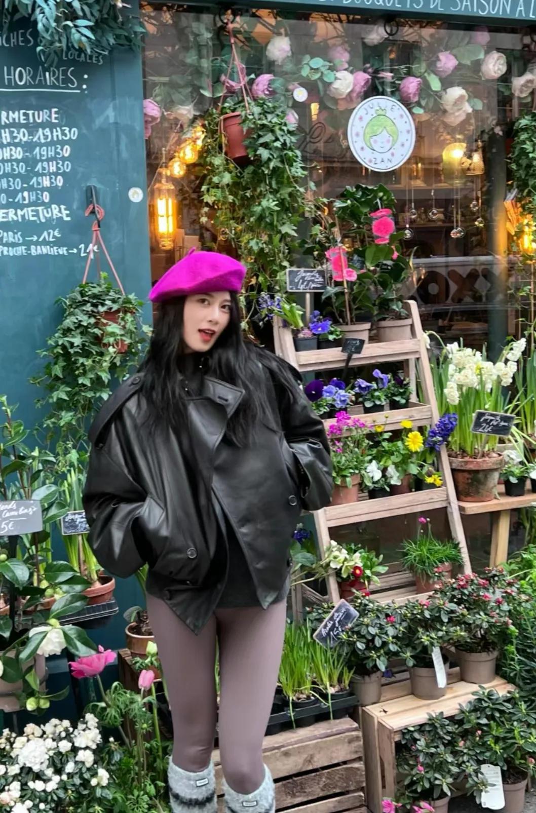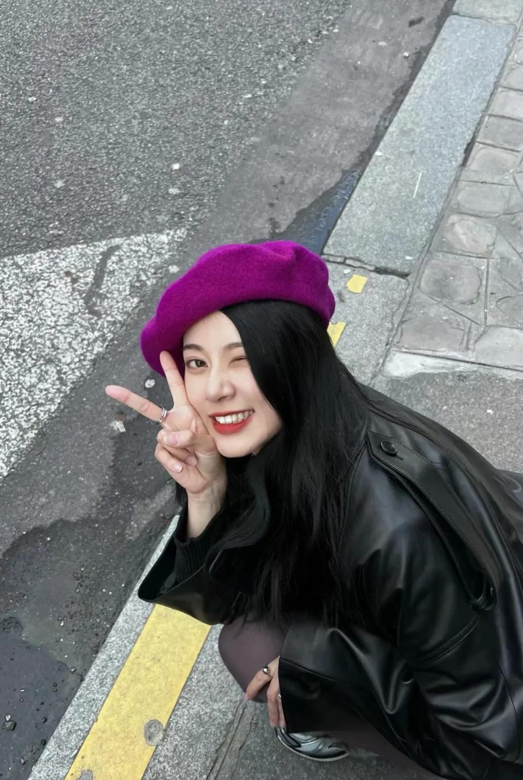赵昭仪巴黎街头照片,这一顶紫色贝雷帽和她好搭,就是这裤子这样穿真的很尴尬,搞不懂