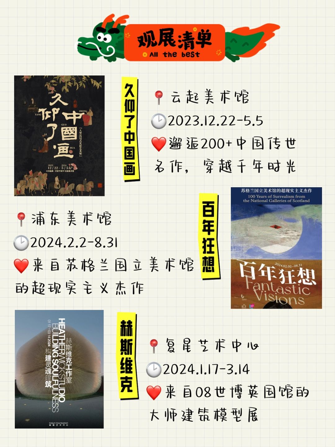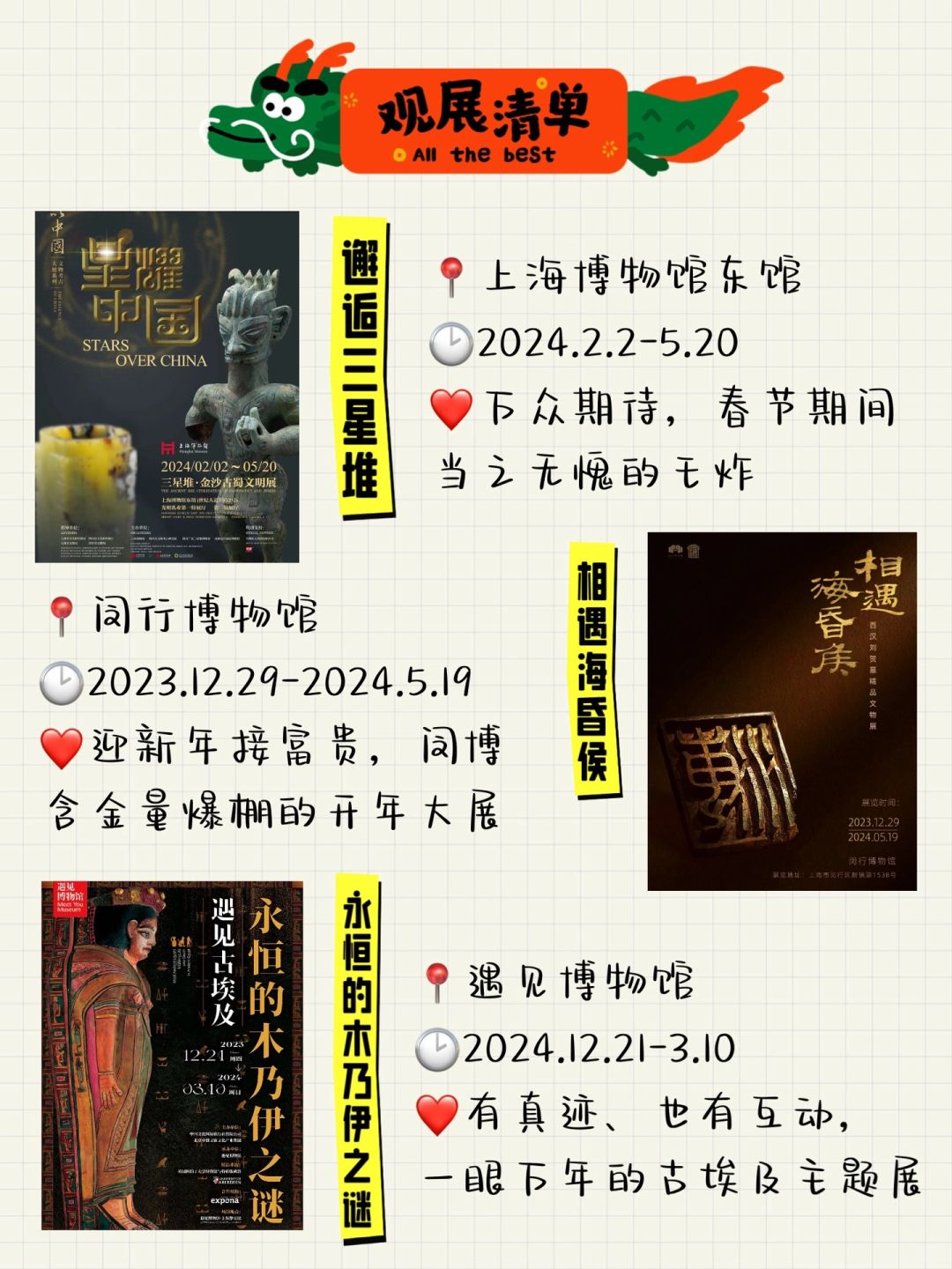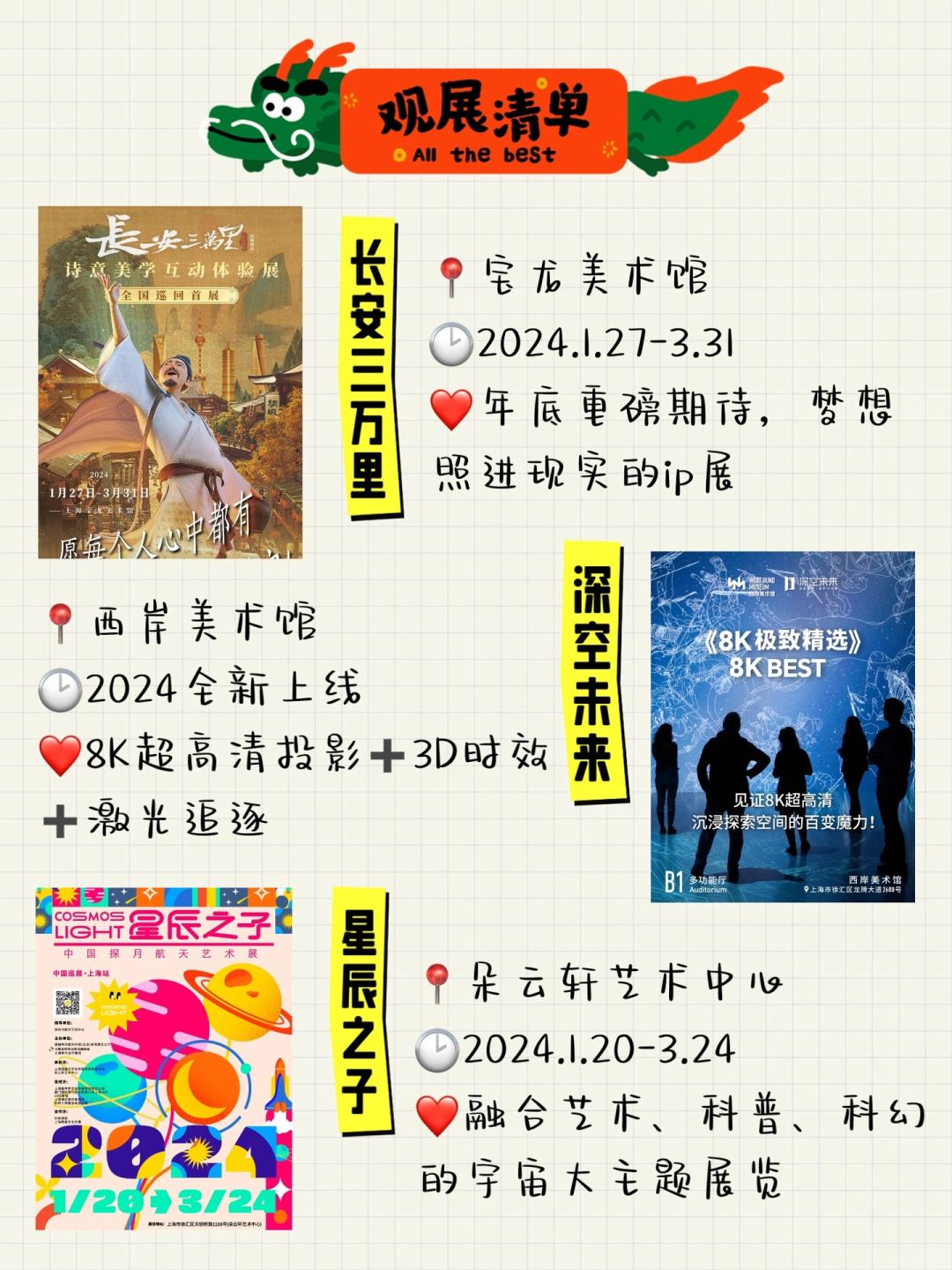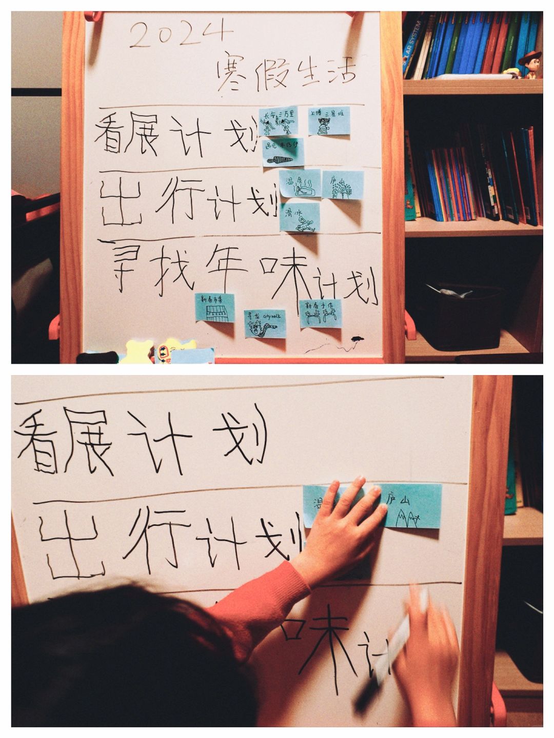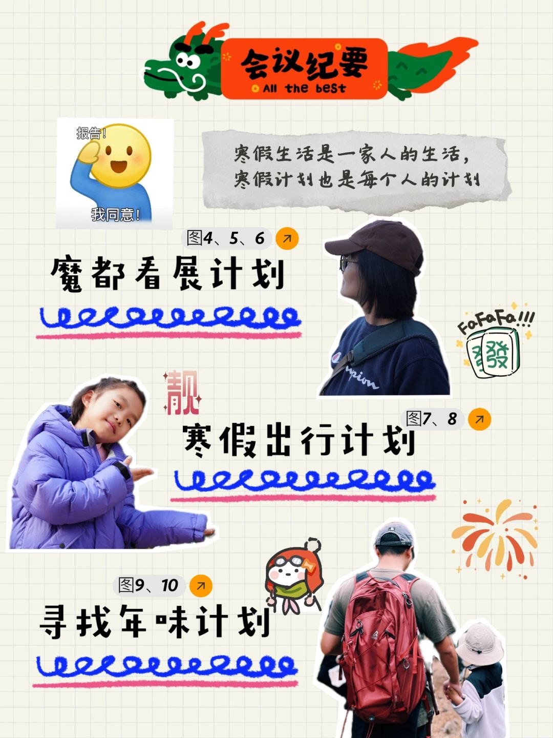 最近也刷到不少妈妈制定的寒假计划,其详尽程度也是让我们很是敬佩! 我们家的大方向还是趁一年级学业还不是很重,玩就要玩得尽兴[派对R] So,为了迎接寒假生活,我们也是真的开了一个kick-off会![doge][doge][doge]和娃一起对齐颗粒度! 📢因为我们认为,寒假生活是一家人的生活,所以要一起制定计划一起完成~ 而且今年我们很遗憾地没来得及安排长线出行,那么不如就好好利用上海及上海周边地资源[喝奶茶R] 👉将平日里约不上的那些展馆都打卡了‼️还要一起到上海街头去寻找年味🐉 当然大前提还是:该完成的作业得做完![大笑R] ————————会议纪要分割线————— 🎯目标一:魔都看展计划(图4、5、6) 以下是我们家今年的观展心愿清单(不完全版哦,好展览还有很多很多……) ✔️长安三万里互动体验展(📍宝龙美术馆) ✔️星辰之子·航天艺术展(📍朵云轩艺术中心) ✔️深空未来·8K超清光影展(📍西岸美术馆) ✔️久仰了,中国画(📍云起美术馆) ✔️马蒂斯的马蒂斯(📍UCCA) ✔️赫斯维克工作室建筑展(📍复星艺术中心) ✔️相遇海昏侯(📍闵行博物馆) ✔️邂逅三星堆(📍上海博物馆东馆) ✔️永恒的木乃伊之谜(📍遇见博物馆) 🎯目标二:寒假出行计划(图7、8) 与长线旅行无缘了,那我们就在上海周边挖掘短途的冬游好去处! 心愿:✅温泉 ✅嬉雪 ✅爬山 🎯目标三:寻找年味计划(图9、10) 🐉寻龙Citywalk: 上海是一座龙来了也得citywalk的城市🧐🧐 🧨新春市集: [蹲后续H]我们也在物色一个年味浓度💯的新春市集,带娃去感受满满的过年仪式感。 很多市集可能还未龍重登场,可以再给它们一些时间,也欢迎大家补充🫴 🧧新春手作: [偷笑R]挑战不买材料包,用家里的闲置当作素材,做出一头龙来!