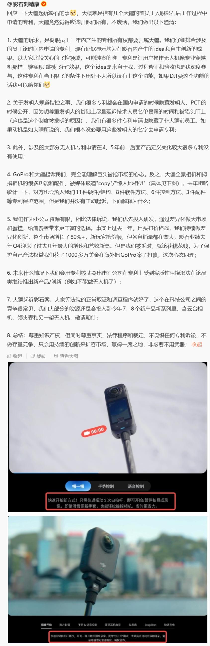 22小时前,微博认证为影石公司CEO的 刘靖康发布长文,回应大疆起诉事宜,全文如下:
