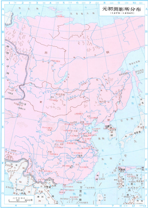 元朝辽阔的疆域,为郭守敬这次在封建时代前所未有的观测活动提供了条件,忽必烈下令派监候官14人分道而出,在东南西北27个地方进行测验,最北端到了北海(今俄罗斯西伯利亚中部通古斯卡河一带,北纬64.1°);最南端到了西沙及中沙群岛以南或东南(北纬15°,今天黄岩岛一带),南北跨度直线距离就长达5000多公里,这就是中国历史上著名的“四海测验”。