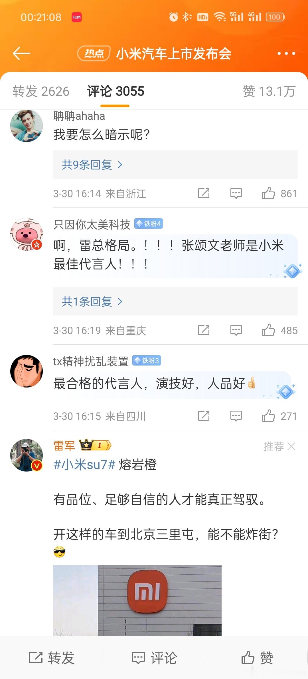 网友:如果你没时间,我随时可以效劳提车!#雷军回复张颂文#