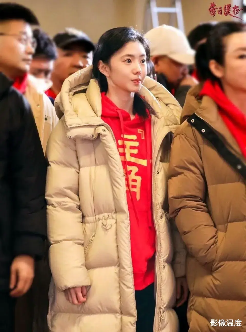 这是开拍合照环节,刘浩存拿着剧组发的开机红包,开心地笑着,站在C位,旁边是张嘉益和他的好大哥孙浩!