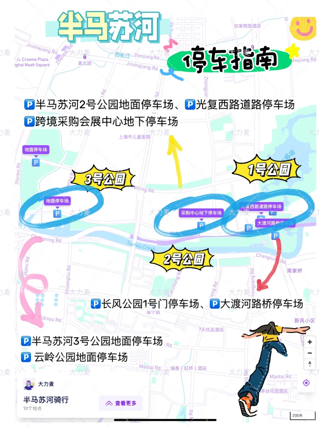 🚗2号公园附近:🅿️半马苏河2号公园地面停车场、🅿️光复西路道路停车场、🅿️跨境采购会展中心地下停车场