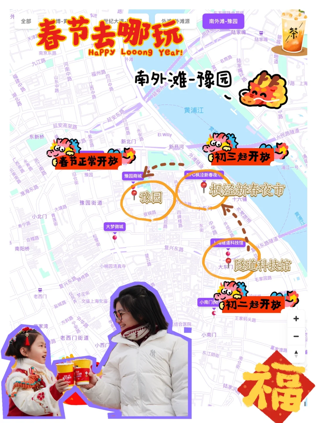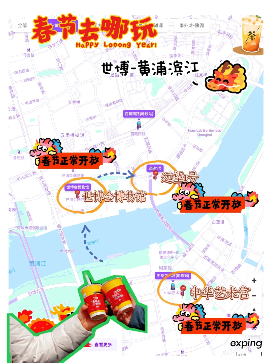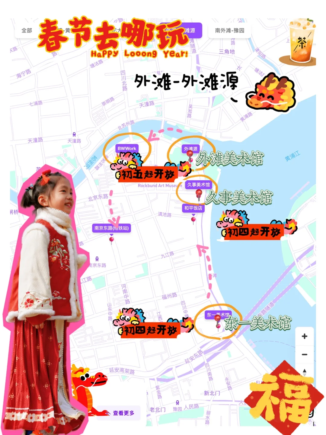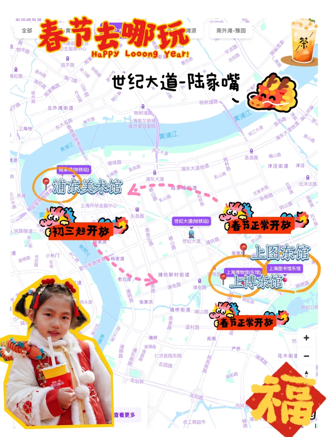 🧧新春快乐,大吉大利🧨🧨 如果你也不离开上海,分享4条不出市区的休闲游玩路线👉 亲子友好,公共交通出行友好,非常适合在过年期间的午后去溜达一圈,消食又快乐🎉 ‼️重要插播: 又又又送福利啦! 大年初一起,在上海街头可以领到大大送出的新春第一杯奶茶🥤 🔍搜索“送你一杯新春慢乐奶茶”就能进入活动页面👉 [打卡R]路线1:南外滩-豫园(图2、3) 📝路线特色:从枫泾新春市集到豫园,一条年味💯的路线,途中还能打卡小众宝藏的隧道科技馆、大梦火车模型主题乐园。 🚶路线信息: 🚇小南门-隧道科技馆-枫泾新春市集-豫园-🚇豫园 🏮出行提示: 枫泾夜市初三正常开放,隧道科技馆初二开放,豫园灯会注意避人流。 [打卡R]路线2:世纪大道-陆家嘴(图4、5) 📝路线特色:✅上博三星堆✅上图宝可梦阅览室,再搭乘3站地铁直达陆家嘴! 🚶路线信息: 🚇世纪大道-上博东馆-上图东馆-🚇陆家嘴-浦东美术馆 🏮出行提示: 上博东馆&上图东馆春节期间正常开放,但入馆均需提前预约,浦美初三开放。 [打卡R]路线3:外滩-外滩源(图6、7) 📝路线特色:一条能打卡3⃣️个美术馆的外滩citywalk 路线,还能便览外滩万国建筑。 🚶路线信息: 🚇南京东路-东一美术馆-和平饭店-久事美术馆-外滩美术馆-🚇南京东路 🏮出行提示: 东一美术馆&久事美术馆初四正常开放,外滩美术馆初五开放,假期前几日建议避人流。 [打卡R]路线4:世博-黄浦滨江(图8、9) 📝路线特色:从浦东的中华艺术宫到浦西的世博会博物馆,两大场馆春节期间都有美育非遗公益课堂! 🚶路线信息: 🚇中华艺术宫-中华艺术宫-🚇西藏南路-黄浦滨江-世博会博物馆 🏮出行提示: 中华艺术宫&世博会博物馆的美育课堂需提前预约。 感谢所有在春节期间依旧坚守在岗位上的工作人员❤️❤️❤️