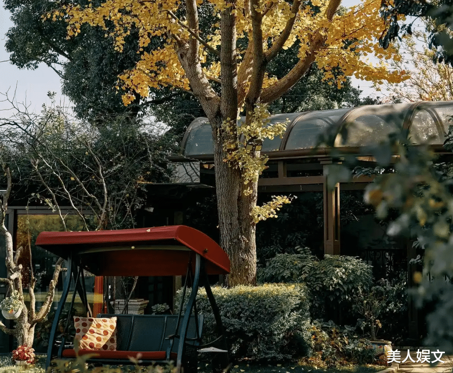 豪宅的户外更是令人惊艳,精心打理的花园四季有景,粗壮的银杏树形成独特风景线,远处的参天大树让人仿佛置身森林,更有一处面积堪比游泳馆的超大泳池,厉玲时常会在这里游泳、带娃,烟火气十足。