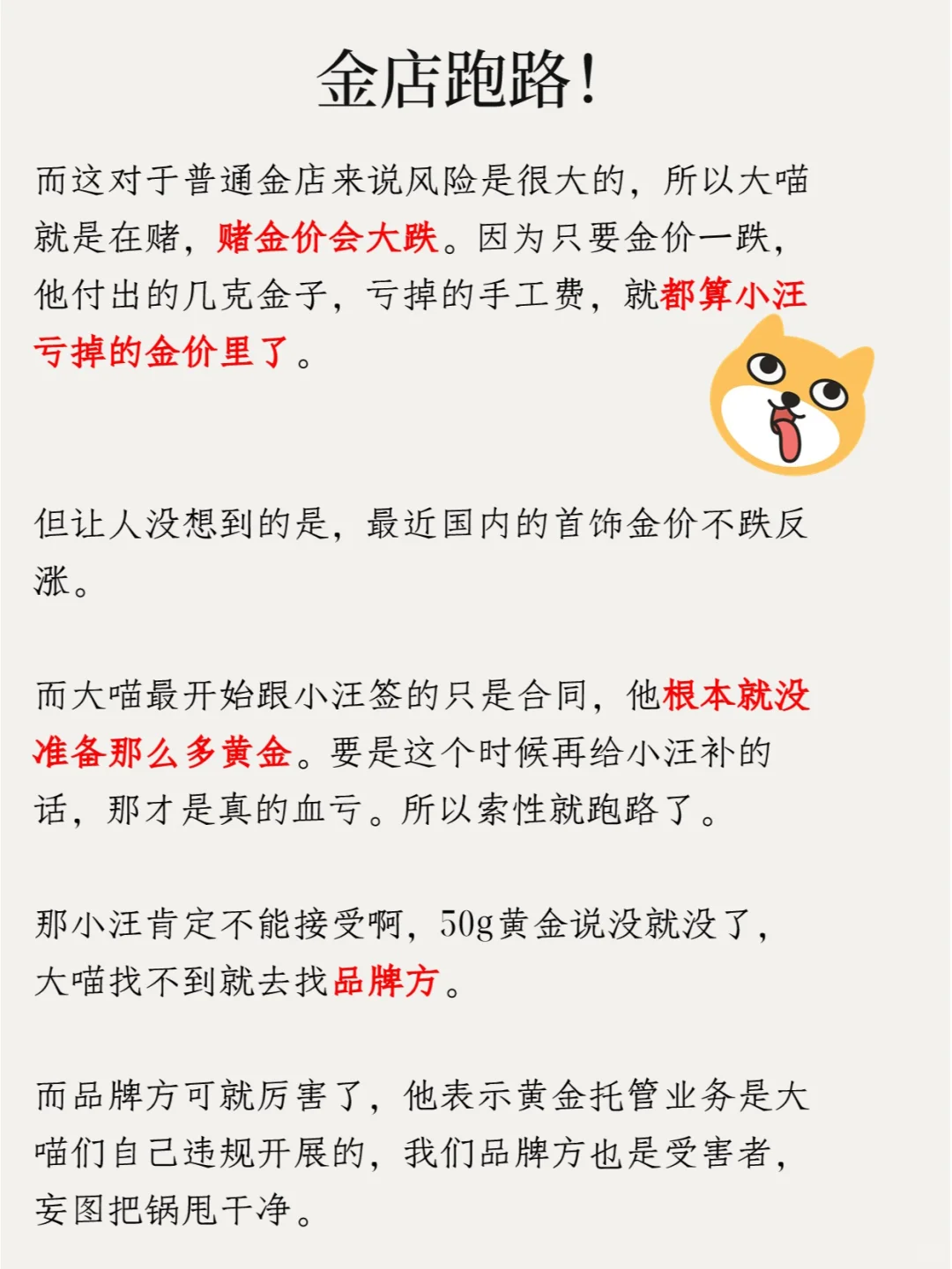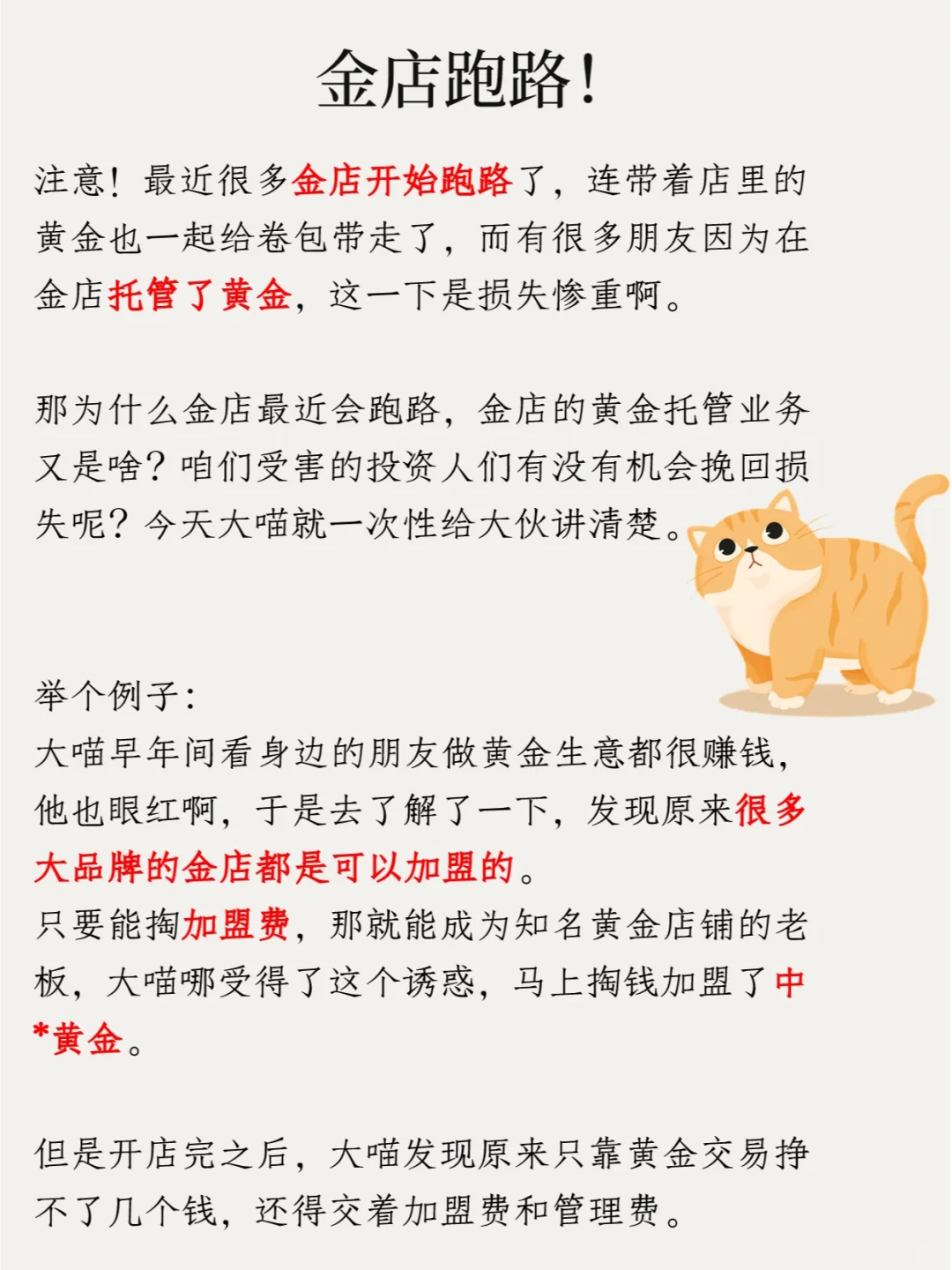那为什么金店最近会跑路,金店的黄金托管业务又是啥?咱们受害的投资人们有没有机会挽回损失呢?今天大喵就一次性给大伙讲清楚。