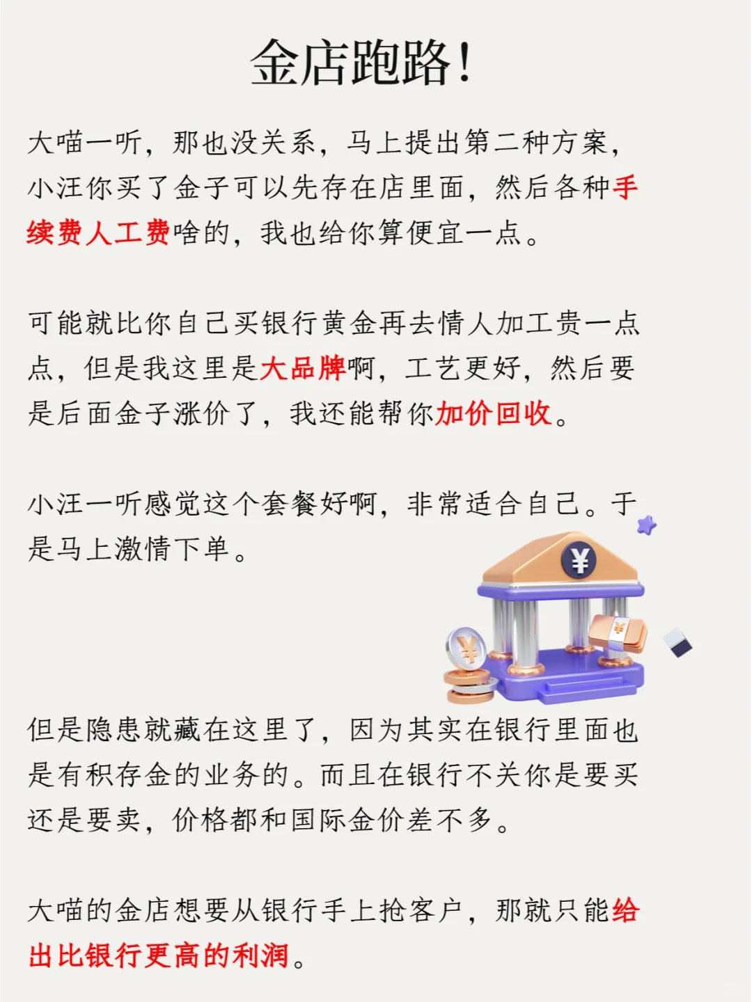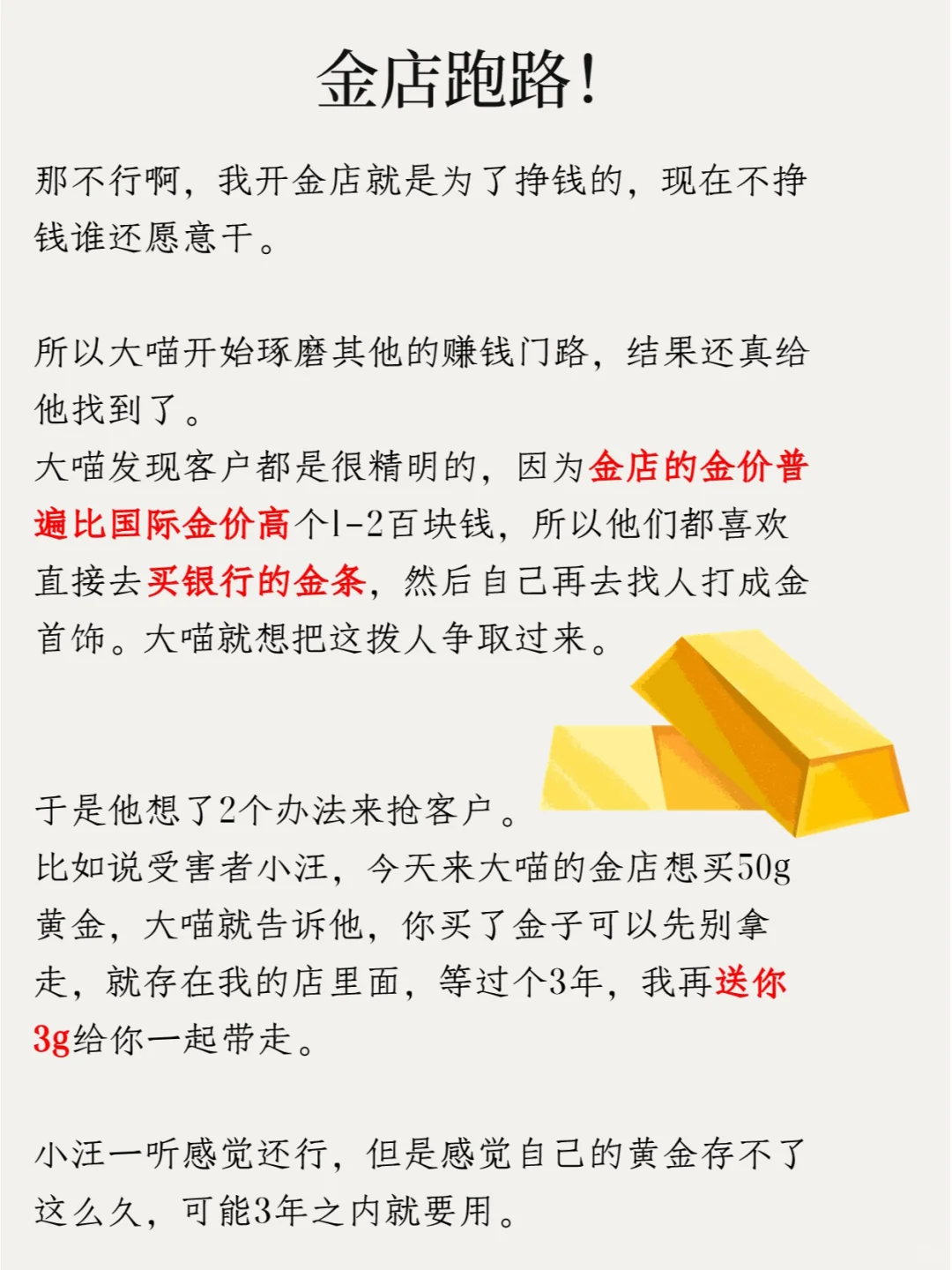 于是他想了2个办法来抢客户。比如说受害者小汪,今天来大喵的金店想买50g黄金,大喵就告诉他,你买了金子可以先别拿走,就存在我的店里面,等过个3年,我再送你3g给你一起带走。