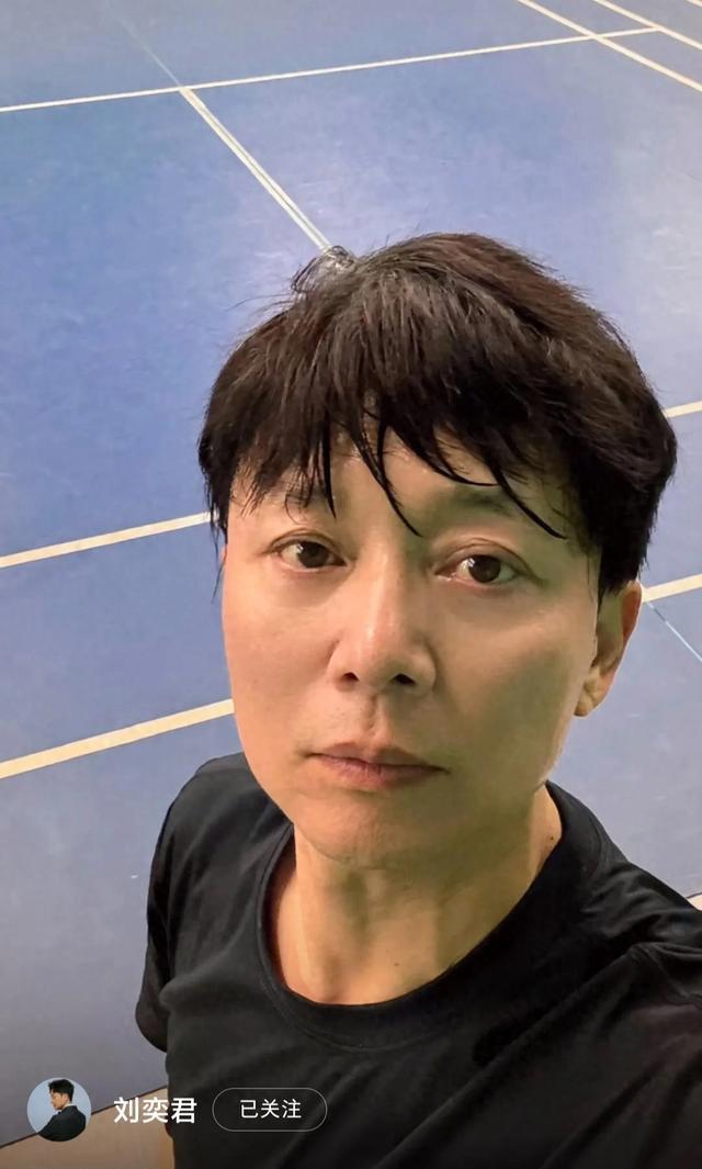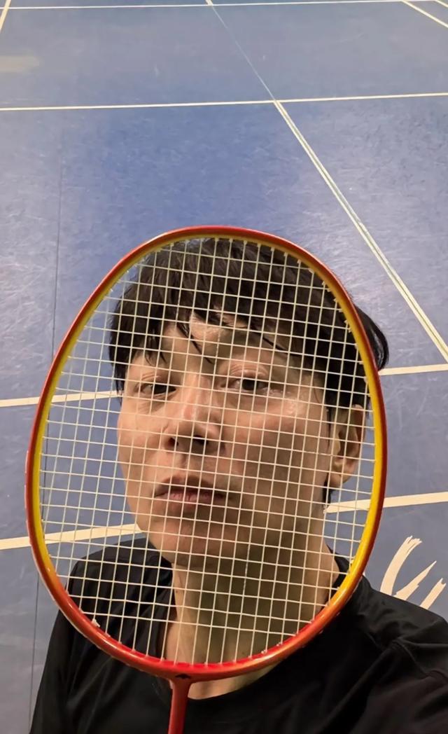 画面中,穿着黑色T恤的他,现身运动场打羽毛球。他应该打得很卖力,头发湿漉漉的。