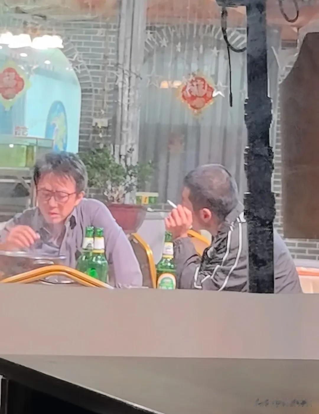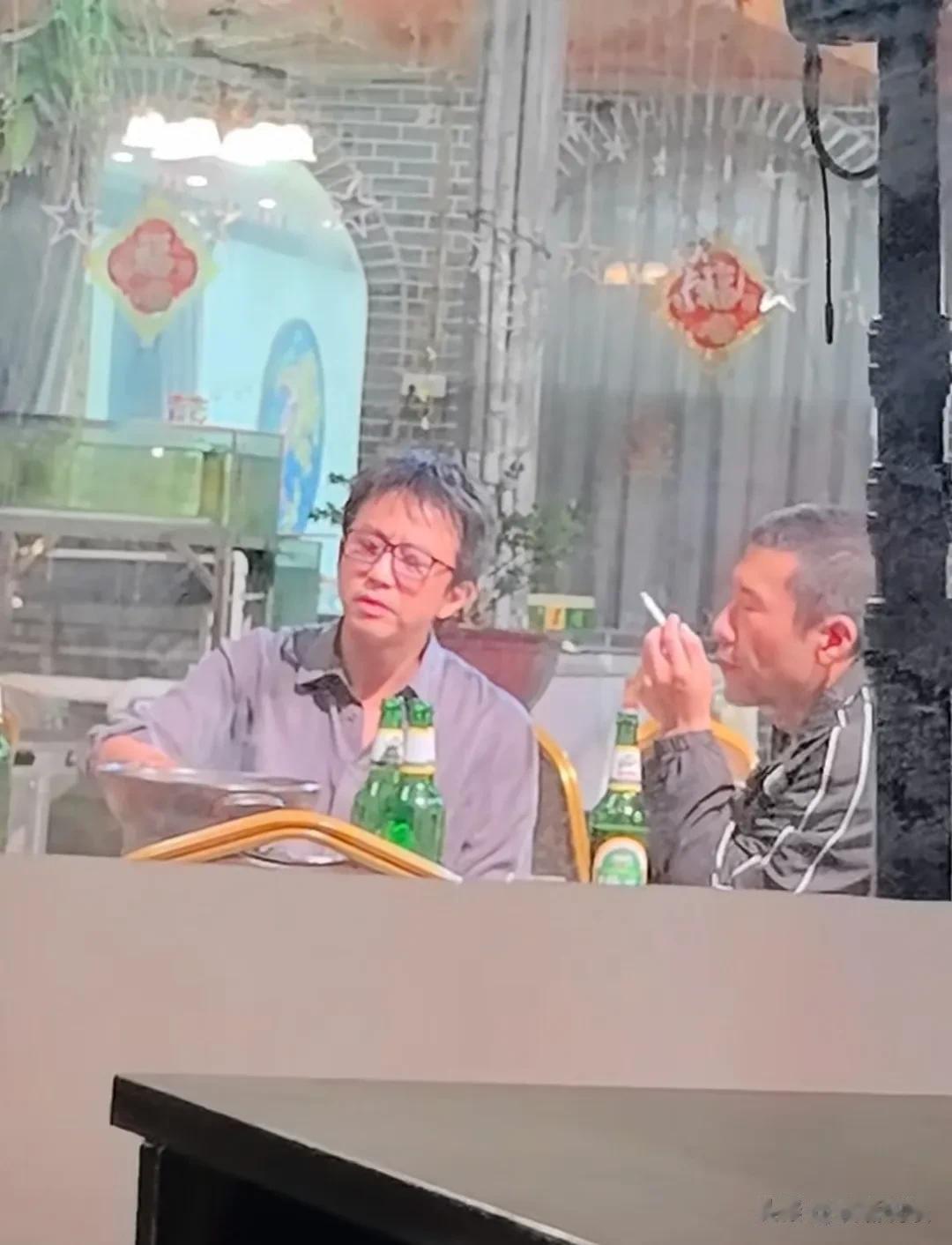 邓超穿着一件衬衫,戴着眼镜,台面上的空啤酒瓶子摆了很多。邓超喝着啤酒,一旁的王骁在劝说着什么。