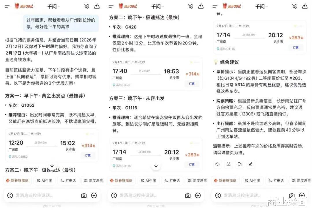 比如,用户说“过年回家,帮我看看从广州到长沙的票,最好是下午的高铁”,千问能立刻拆解出出发地、目的地、出行方式、时间偏好这些关键信息,精准匹配对应的高铁票源。