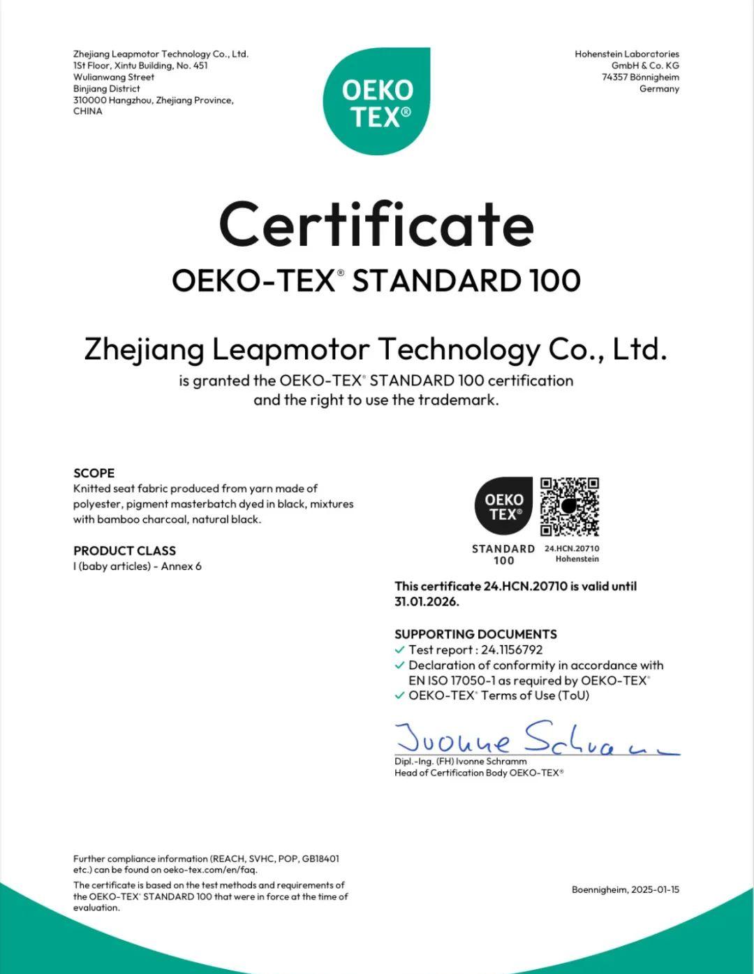 零跑B10的座椅,就体现了这种“从源头抓起”的理念。它采用了竹炭纤维成分面料,这种面料不仅触感舒适,更具有强大的吸附能力,能够有效吸附空气中的有害物质和异味,保持车内空气清新。而且,竹炭纤维还具有天然的抗菌防臭功能,能够抑制细菌滋生,进一步提升车内环境的健康程度。值得一提的是,这种面料还获得了欧盟OEKO-TEX STANDARD 100的最高环保标准认证,达到婴儿安全级别,即使是婴幼儿也能安心乘坐。