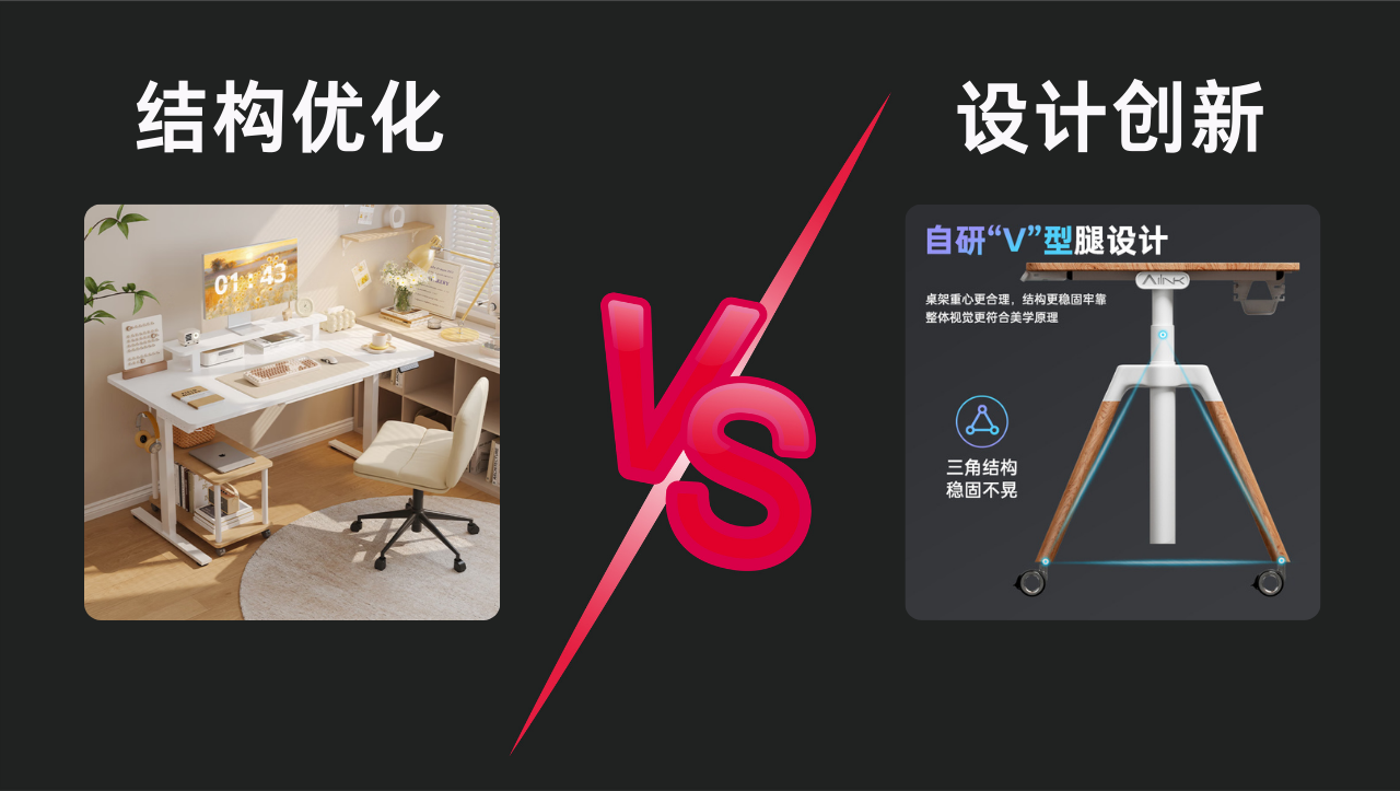 •爱琳:独创三角桌角设计,通过力学优化大幅提升稳定性,即便频繁调节高度,桌面依旧平稳如初,为贵重物品提供安全放置环境,细节设计尽显匠心。