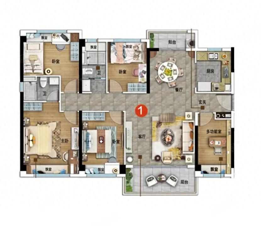 整体来看,这个户型没有浪费空间,五卧保障居住需求、双明卫提升舒适度、餐厨客厅动线合理,完全是能满足长期居住的“终极”选择。
