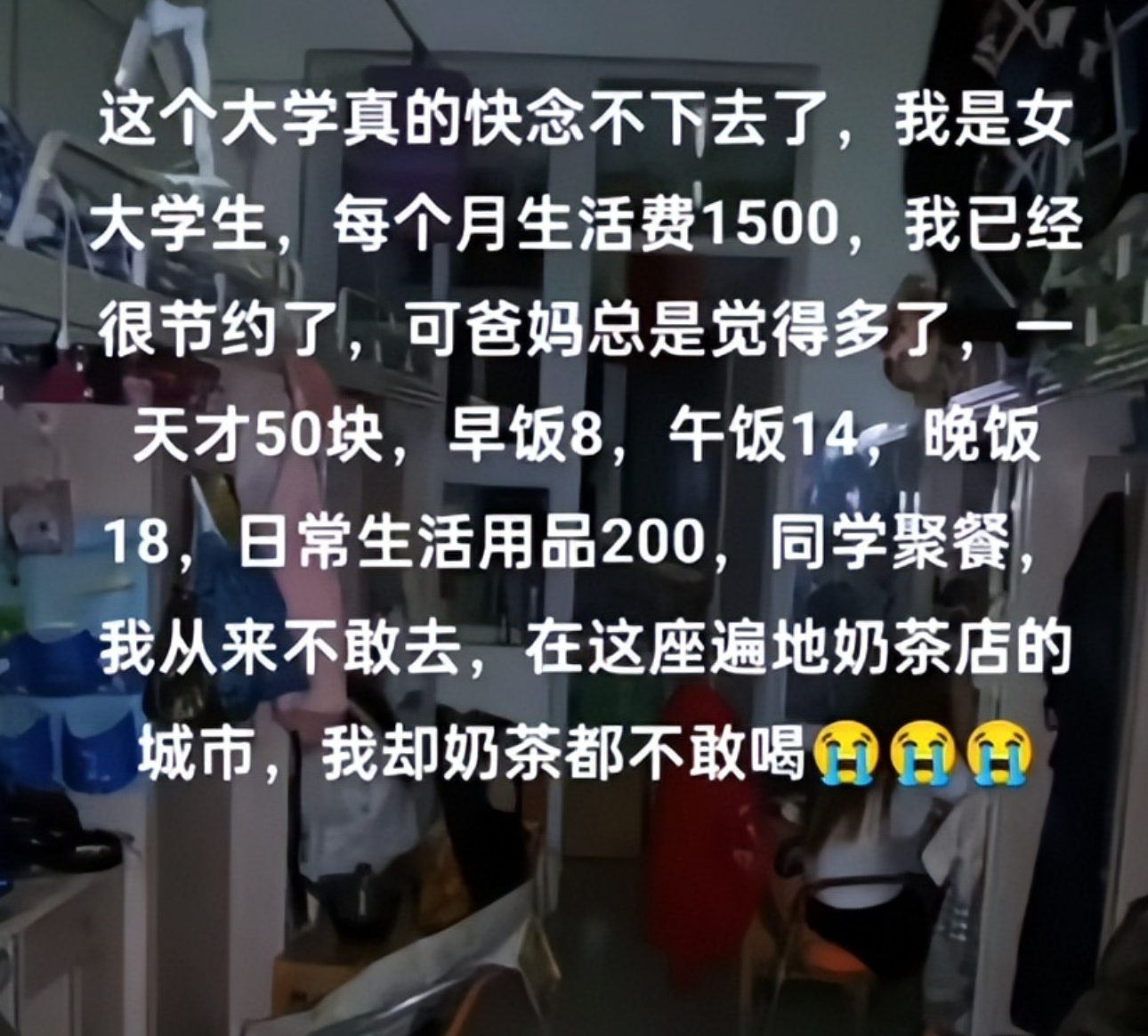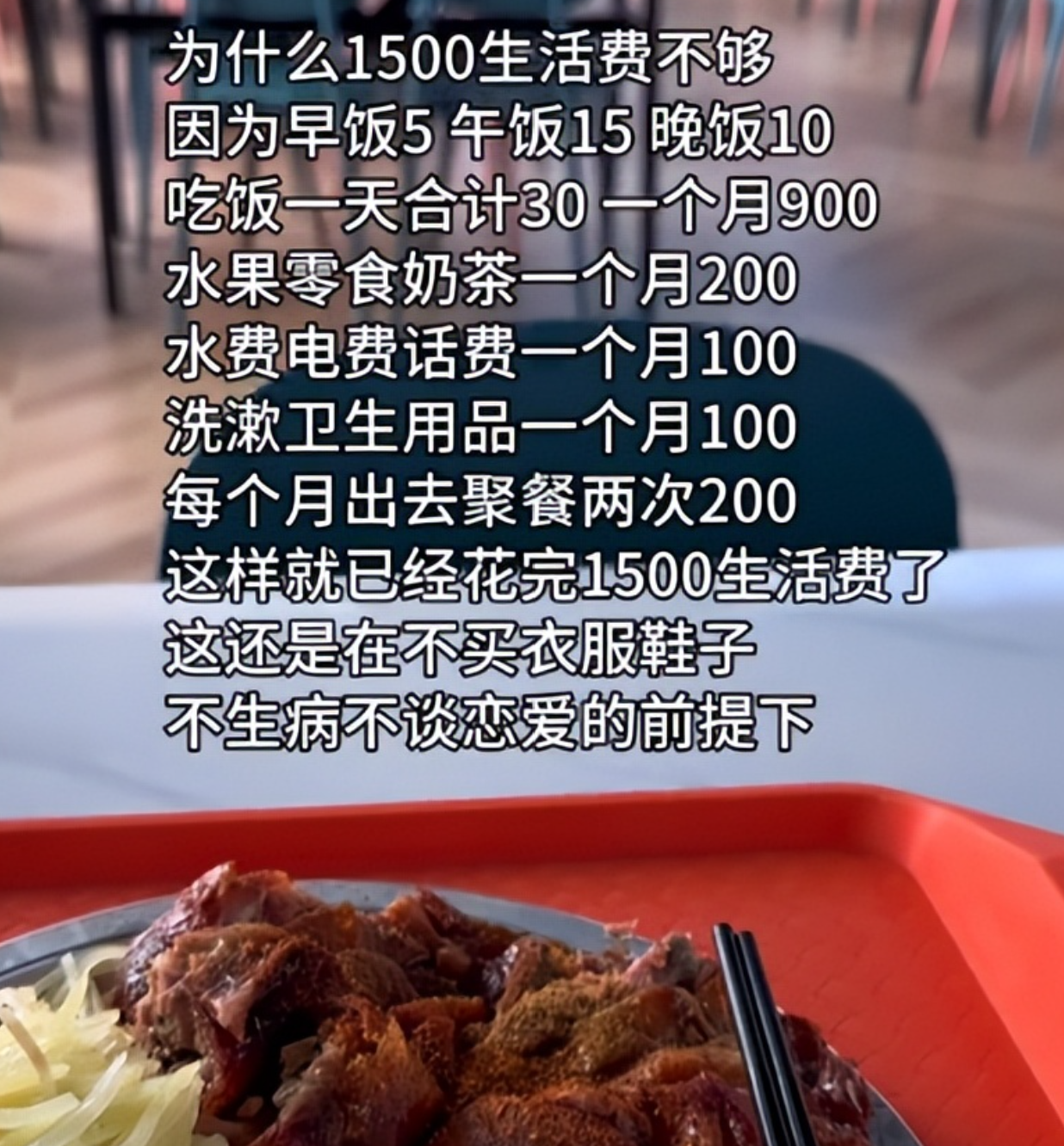 "不当家不知柴米贵"的老话,在这届年轻人身上似乎调了个个儿。最近,一位女大学生抹着眼泪算账的视频火了——每月1500元生活费被她掰成八瓣花:30块的日餐标、45元的水电分摊、299元的连衣裙,算来算去总差口气。对比室友两三千的"零花钱自由",这姑娘越说越委屈,却意外撞上网友的"算盘阵":2023年教育部数据显示,全国大学生月均消费1283元,食堂八块钱的套餐管饱,这日子怎么就过成了"生存挑战"?究竟是父母给的太少,还是年轻一代掉进了消费主义的漩涡?